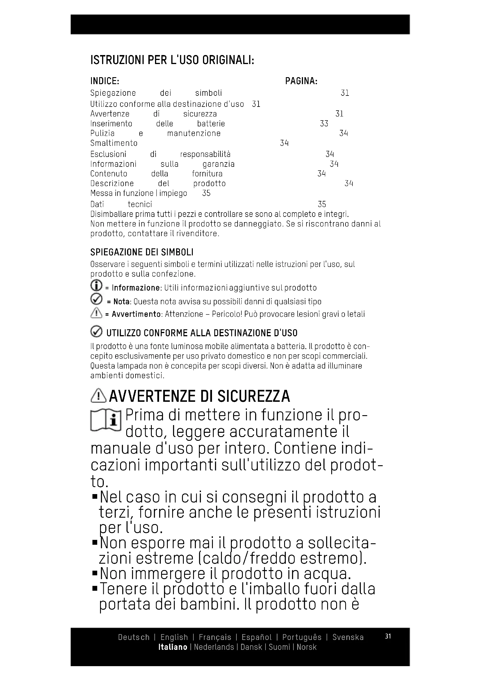 Attenzione! §Questo prodotto contiene batterie. Non gettare il prodotto nel fuoco §Se le batterie non sono inserite corret-33 tamente, possono perdere e/o provoca- re un incendio/esplosione §Sostituire le batterie tutte insieme e uti- lizzare sempre batterie dello stesso tipo §Tenere le batterie lontane dalla portata dei bambini: pericolo di ingerimento e soffocamento §Non tentare mai di aprire una batteria, né di schiacciarla, riscaldarla o infiammarla §Non usare le batterie se il prodotto sem- bra danneggiato §Le batterie non sono ricaricabili §Smaltire le batterie usate sempre nel rispetto delle norme di legge o dei requi- siti locali §Se le batterie dovessero perdere, non toccarle. Ma se si dovesse entrare in contatto con il liquido delle batterie, lavare subito la parte interessata accu- ratamente con acqua. §Se il liquido delle batterie provoca una reazione cutanea o raggiunge gli occhi, consultare subito un medico §Non cortocircuitare le batterie! §A causa di altri valori elettrici, non è consentito usare batterie ricaricabili e ad alta corrente §Togliere le batterie immediatamente dal- la lampada se sono esauste o scariche §Qualora non sia più possibile utilizzare la lampada occorre rimuovere le batterie prima dello smaltimento