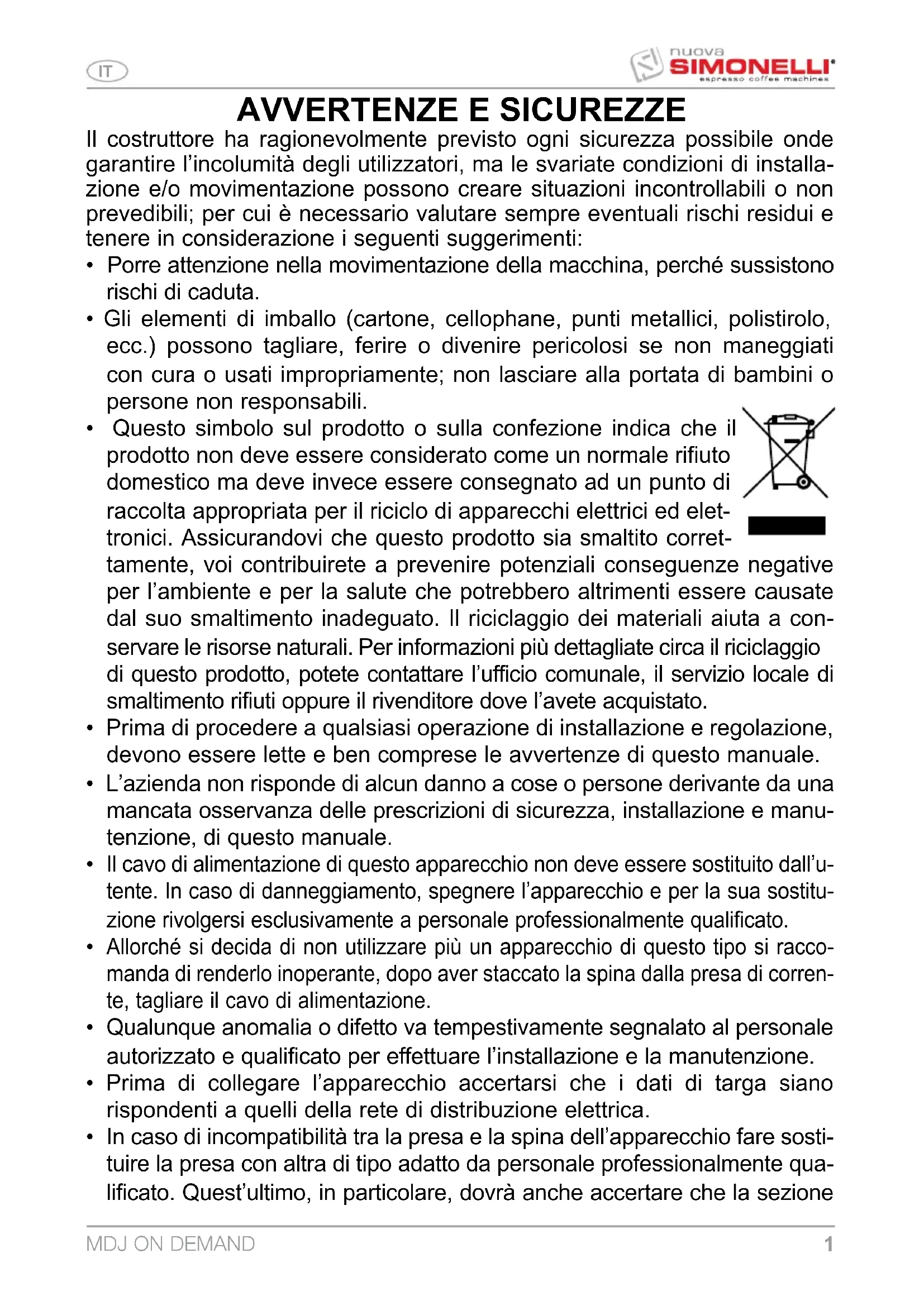SERIAL Nr. FROM: 0001-14 al quale si riferisce questa dichiarazione, è costruito in conformità alle direttive: to which this declaration relates, following the provisions of the directives: 2006/42/CE - 2006/95/CE - 2004/108/CE 2002/95/CE - 2002/96/CE - 2003/108/CE Data: Giugno 2015 Date: June 2015 Nuova Simonelli S.p.a L'Amministratore Delegato (Ottavi Nando)La Nuova Simonelli si riserva di apportare tutte le modifiche ritenute necessarie. Via M. d’Antegiano, 6 62020 Belforte del Chienti Macerata Italy Tel. +39.0733.9501 Fax +39.0733-950242 www.nuovasimonelli.it E-mail: n.simonelli@nuovasimonelli.it Nuova Distribution Centre LLC 6940Salashan PKWY BLDG A 98248 Ferdale, WA Tel. +1.360.3662226 Fax +1.3603664015 videoconf.+1.360.3188595 www.nuovasimonelli.it info@nuovasimonelli.com