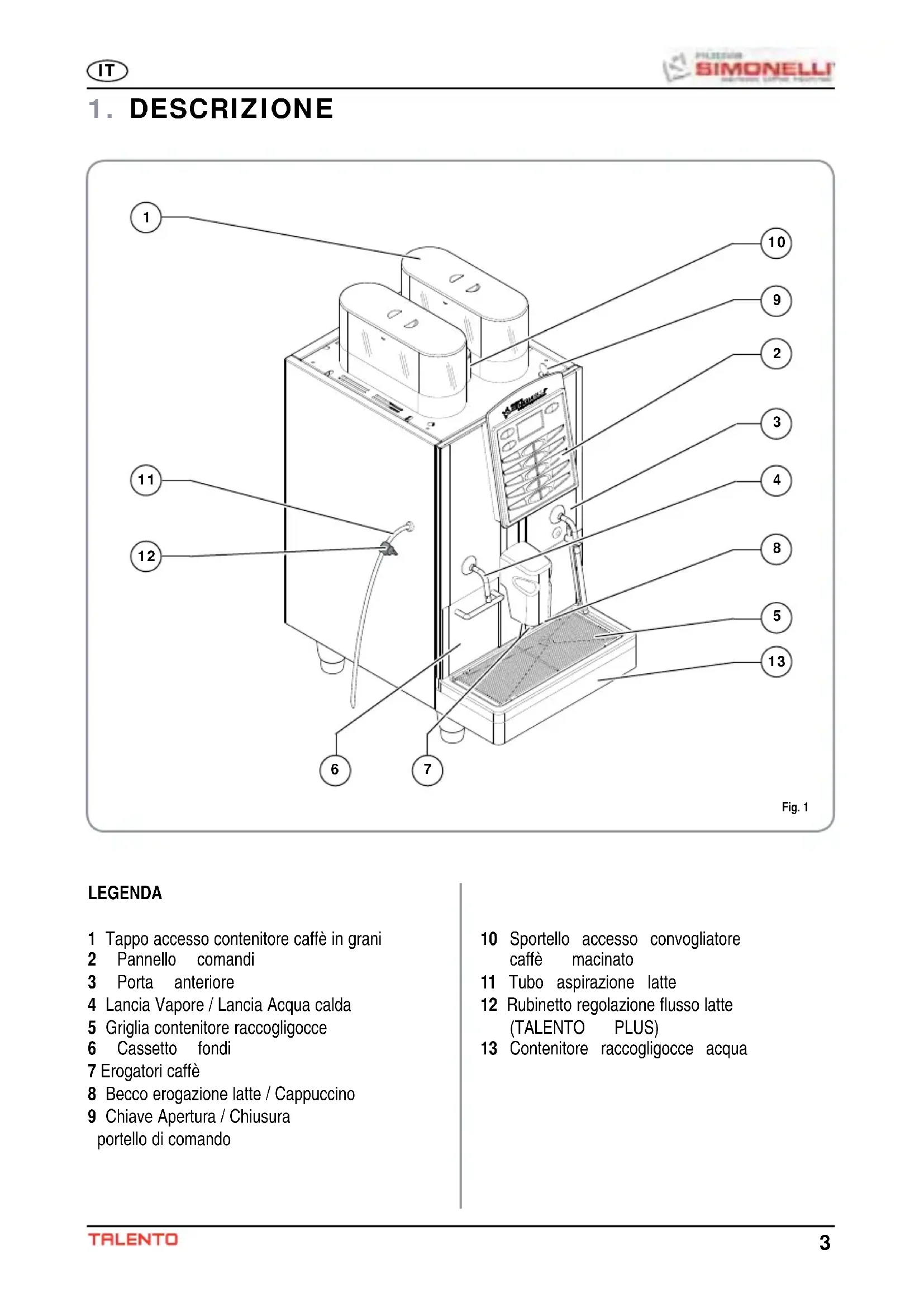 LEGENDA 1 Tappo accesso contenitore caffè in grani 2 Pannello comandi 3 Porta anteriore 4 Lancia Vapore / Lancia Acqua calda 5 Griglia contenitore raccogligocce 6 Cassetto fondi 7 Erogatori caffè 8 Becco erogazione latte / Cappuccino 9 Chiave Apertura / Chiusura portello di comando 10 Sportello accesso convogliatore caffè macinato 11 Tubo aspirazione latte 12 Rubinetto regolazione flusso latte (TALENTO PLUS) 13 Contenitore raccogligocce acqua