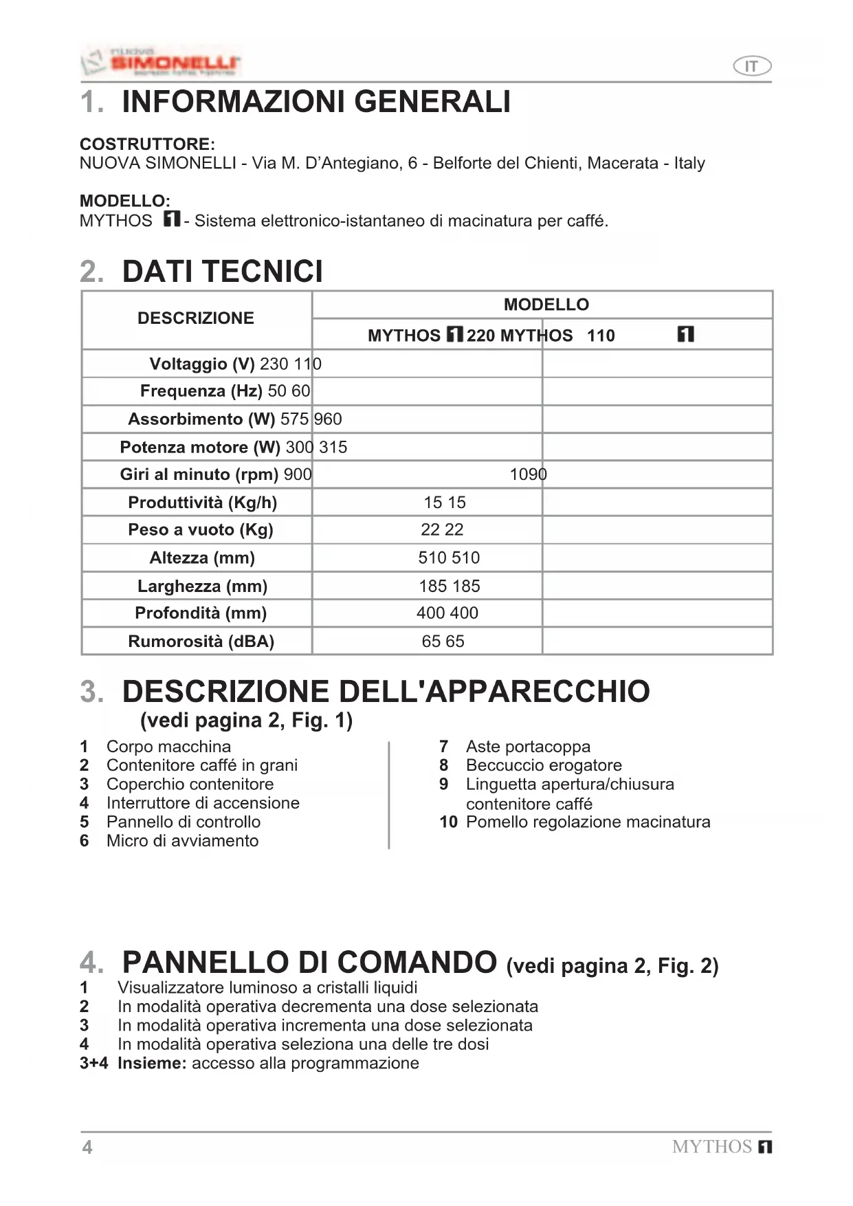 1 Corpo macchina 2 Contenitore caffé in grani 3 Coperchio contenitore 4 Interruttore di accensione 5 Pannello di controllo 6 Micro di avviamento 7 Aste portacoppa 8 Beccuccio erogatore 9 Linguetta apertura/chiusura contenitore caffé 10 Pomello regolazione macinatura 1 Visualizzatore luminoso a cristalli liquidi 2 In modalità operativa decrementa una dose selezionata 3 In modalità operativa incrementa una dose selezionata 4 In modalità operativa seleziona una delle tre dosi 3+4 Insieme: accesso alla programmazione5 MYTHOS
