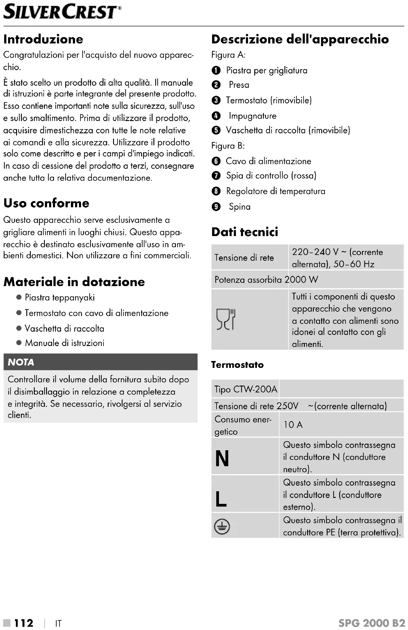 IT SPG 2000 B2 Introduzione Congratulazioni per l'acquisto del nuovo apparec- chio. È stato scelto un prodotto di alta qualità. Il manuale di istruzioni è parte integrante del presente prodotto. Esso contiene importanti note sulla sicurezza, sull'uso e sullo smaltimento. Prima di utilizzare il prodotto, acquisire dimestichezza con tutte le note relative ai comandi e alla sicurezza. Utilizzare il prodotto solo come descritto e per i campi d'impiego indicati. In caso di cessione del prodotto a terzi, consegnare anche tutta la relativa documentazione. Uso conforme Questo apparecchio serve esclusivamente a grigliare alimenti in luoghi chiusi. Questo appa- recchio è destinato esclusivamente all'uso in am- bienti domestici. Non utilizzare a fini commerciali. Materiale in dotazione ▯ Piastra teppanyaki ▯ Termostato con cavo di alimentazione ▯ Vaschetta di raccolta ▯ Manuale di istruzioni NOTA Controllare il volume della fornitura subito dopo il disimballaggio in relazione a completezza e integrità. Se necessario, rivolgersi al servizio clienti. Descrizione dell'apparecchio Figura A: 1 Piastra per grigliatura 2 Presa 3 Termostato (rimovibile) 4 Impugnature 5 Vaschetta di raccolta (rimovibile) Figura B: 6 Cavo di alimentazione 7 Spia di controllo (rossa) 8 Regolatore di temperatura 9 Spina Dati tecnici Tensione di rete 220–240 V ∼ (corrente alternata), 50–60 Hz Potenza assorbita 2000 W Tutti i componenti di questo apparecchio che vengono a contatto con alimenti sono idonei al contatto con gli alimenti. Termostato Tipo CTW-200A Tensione di rete 250 V