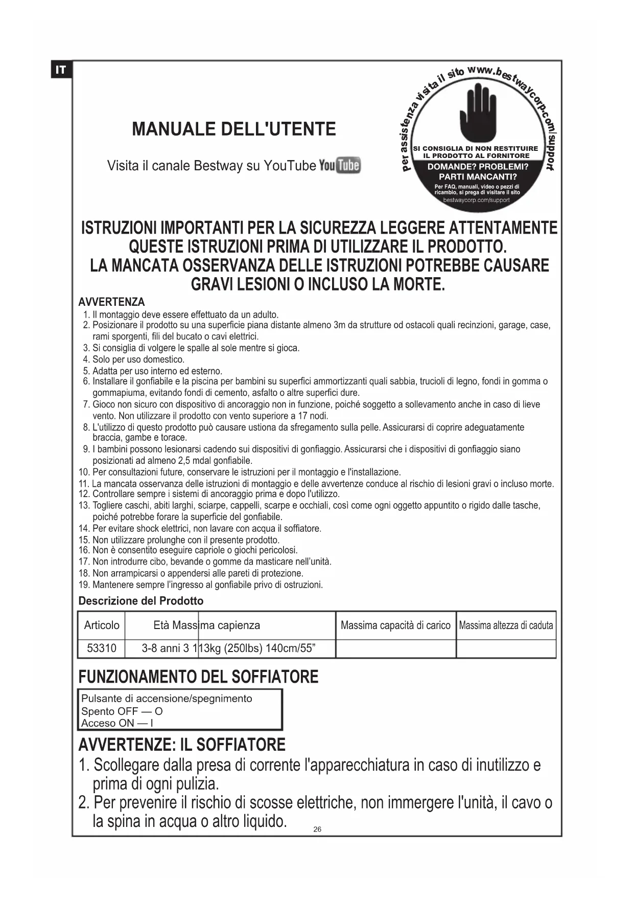DOMANDE? PROBLEMI? PARTI MANCANTI? Per FAQ, manuali, video o pezzi di ricambio, si prega di visitare il sito bestwaycorp.com/support Visita il canale Bestway su YouTube