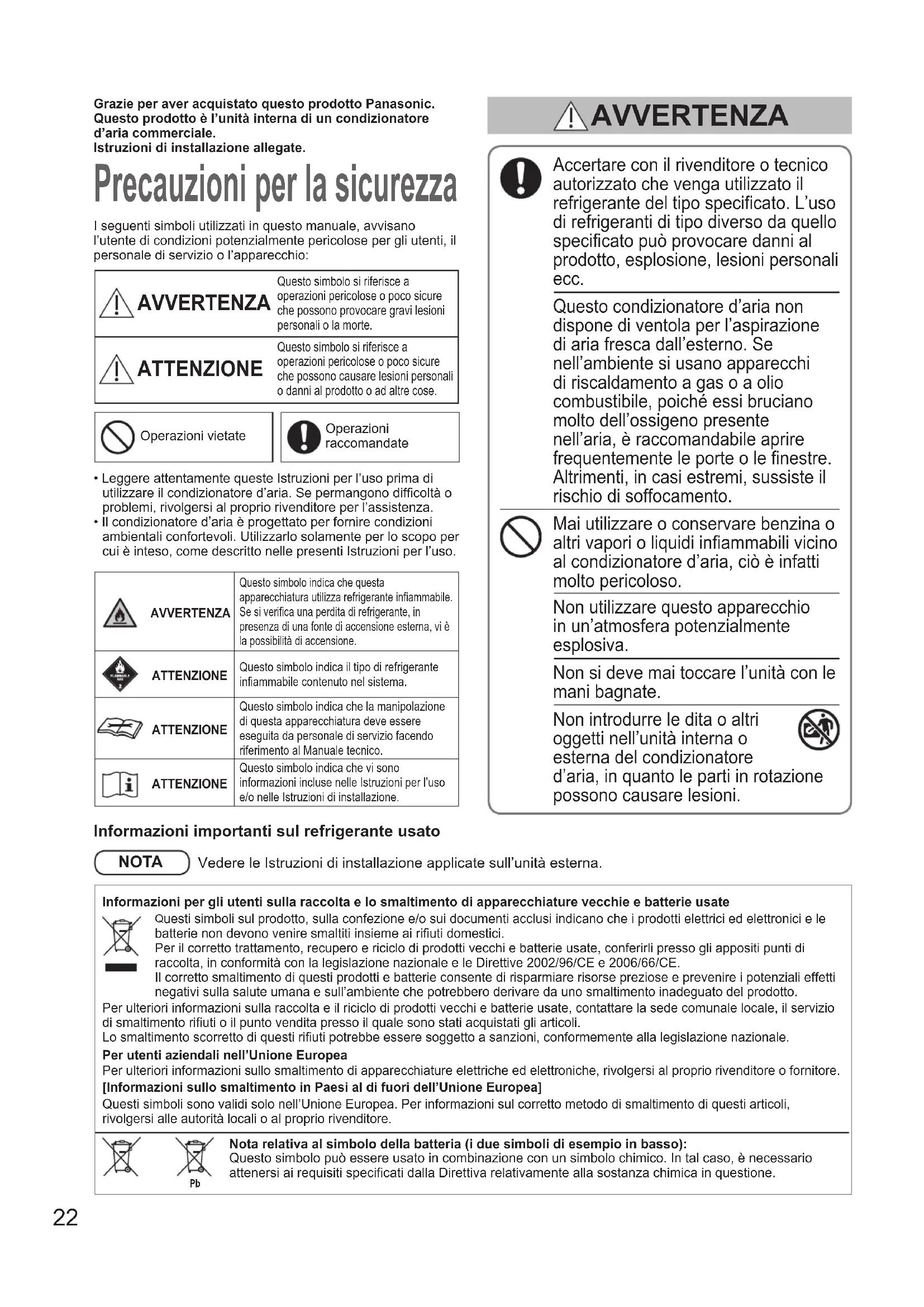 Filter-AnzeigeKabel-FernbedienungLuftauslassMit einem weichen Tuch abwischen.(Bei starker Verschmutzung ein mit Wasser angefeuchtetes Tuch verwenden.)LufteinlassFilter-Anzeige 00_330260_all.indb 21 2020/11/23 13:35:1122 Grazie per aver acquistato questo prodotto Panasonic.Questo prodotto è l’unità interna di un condizionatore d’aria commerciale.Istruzioni di installazione allegate. Precauzioni per la sicurezza I seguenti simboli utilizzati in questo manuale, avvisano l’utente di condizioni potenzialmente pericolose per gli utenti, il personale di servizio o l’apparecchio: AVVERTENZA Questo simbolo si riferisce a operazioni pericolose o poco sicure che possono provocare gravi lesioni personali o la morte. ATTENZIONE Questo simbolo si riferisce a operazioni pericolose o poco sicure che possono causare lesioni personali o danni al prodotto o ad altre cose.Operazioni vietateOperazioni raccomandate• Leggere attentamente queste Istruzioni per l’uso prima di utilizzare il condizionatore d’aria. Se permangono difcoltà o problemi, rivolgersi al proprio rivenditore per l’assistenza.• Il condizionatore d’aria è progettato per fornire condizioni ambientali confortevoli. Utilizzarlo solamente per lo scopo per cui è inteso, come descritto nelle presenti Istruzioni per l’uso. Accertare con il rivenditore o tecnico autorizzato che venga utilizzato il refrigerante del tipo specicato. L’uso di refrigeranti di tipo diverso da quello specicato può provocare danni al prodotto, esplosione, lesioni personali ecc. Questo condizionatore d’aria non dispone di ventola per l’aspirazione di aria fresca dall’esterno. Se nell’ambiente si usano apparecchi di riscaldamento a gas o a olio combustibile, poiché essi bruciano molto dell’ossigeno presente nell’aria, è raccomandabile aprire frequentemente le porte o le nestre. Altrimenti, in casi estremi, sussiste il rischio di soffocamento. Mai utilizzare o conservare benzina o altri vapori o liquidi inammabili vicino al condizionatore d’aria, ciò è infatti molto pericoloso. Non utilizzare questo apparecchio in un’atmosfera potenzialmente esplosiva. Non si deve mai toccare l’unità con le mani bagnate. Non introdurre le dita o altri oggetti nell’unità interna o esterna del condizionatore d’aria, in quanto le parti in rotazione possono causare lesioni. AVVERTENZA AVVERTENZAQuesto simbolo indica che questa apparecchiatura utilizza refrigerante infiammabile. Se si verifica una perdita di refrigerante, in presenza di una fonte di accensione esterna, vi è la possibilità di accensione.ATTENZIONEQuesto simbolo indica il tipo di refrigerante infiammabile contenuto nel sistema.ATTENZIONEQuesto simbolo indica che la manipolazione di questa apparecchiatura deve essere eseguita da personale di servizio facendo riferimento al Manuale tecnico.ATTENZIONEQuesto simbolo indica che vi sono informazioni incluse nelle Istruzioni per l’uso e/o nelle Istruzioni di installazione.Informazioni importanti sul refrigerante usato NOTA Vedere le Istruzioni di installazione applicate sull’unità esterna.Informazioni per gli utenti sulla raccolta e lo smaltimento di apparecchiature vecchie e batterie usate