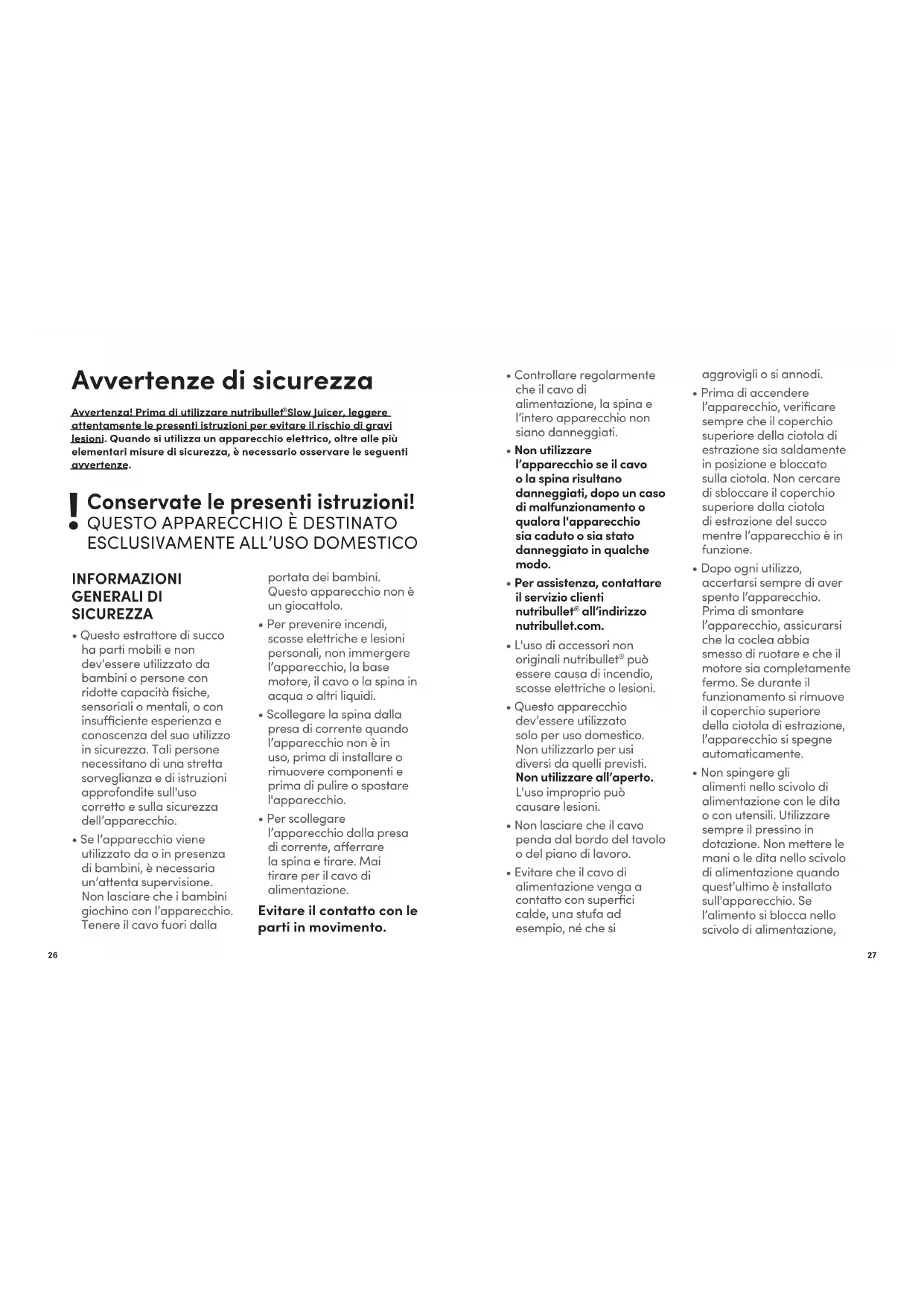 - Questo estrattore di succo ha parti mobili e non dev’essere utilizzato da bambini o persone con ridotte capacità fisiche, sensoriali o mentali, o con insuciente esperienza e conoscenza del suo utilizzo in sicurezza. Tali persone necessitano di una stretta sorveglianza e di istruzioni approfondite sull'uso corretto e sulla sicurezza dell’apparecchio.• Se l’apparecchio viene utilizzato da o in presenza di bambini, è necessaria un’attenta supervisione. Non lasciare che i bambini giochino con l’apparecchio. Tenere il cavo fuori dalla portata dei bambini. Questo apparecchio non è un giocattolo.• Per prevenire incendi, scosse elettriche e lesioni personali, non immergere l’apparecchio, la base motore, il cavo o la spina in acqua o altri liquidi.• Scollegare la spina dalla presa di corrente quando l’apparecchio non è in uso, prima di installare o rimuovere componenti e prima di pulire o spostare l'apparecchio.• Per scollegare l’apparecchio dalla presa di corrente, aerrare la spina e tirare. Mai tirare per il cavo di alimentazione.Evitare il contatto con le parti in movimento. Avvertenze di sicurezza Avvertenza! Prima di utilizzare nutribullet Slow Juicer, leggere attentamente le presenti istruzioni per evitare il rischio di gravi lesioni. Quando si utilizza un apparecchio elettrico, oltre alle più elementari misure di sicurezza, è necessario osservare le seguenti avvertenze. Conservate le presenti istruzioni!