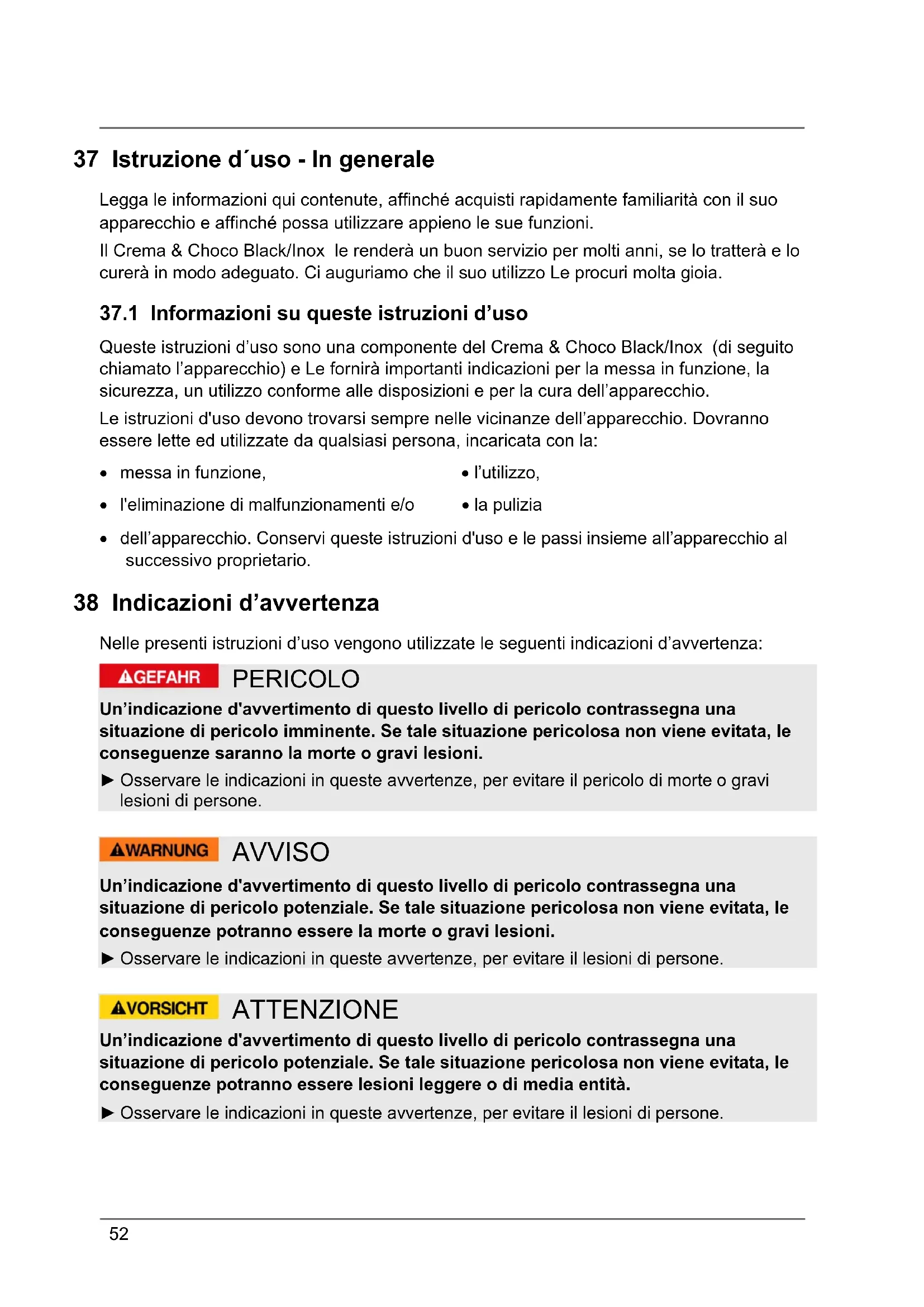- dell’apparecchio. Conservi queste istruzioni d'uso e le passi insieme all’apparecchio al successivo proprietario. 38 Indicazioni d’avvertenza Nelle presenti istruzioni d’uso vengono utilizzate le seguenti indicazioni d’avvertenza: PERICOLO Un’indicazione d'avvertimento di questo livello di pericolo contrassegna una situazione di pericolo imminente. Se tale situazione pericolosa non viene evitata, le conseguenze saranno la morte o gravi lesioni. ► Osservare le indicazioni in queste avvertenze, per evitare il pericolo di morte o gravi lesioni di persone. AVVISO Un’indicazione d'avvertimento di questo livello di pericolo contrassegna una situazione di pericolo potenziale. Se tale situazione pericolosa non viene evitata, le conseguenze potranno essere la morte o gravi lesioni. ► Osservare le indicazioni in queste avvertenze, per evitare il lesioni di persone. ATTENZIONE Un’indicazione d'avvertimento di questo livello di pericolo contrassegna una situazione di pericolo potenziale. Se tale situazione pericolosa non viene evitata, le conseguenze potranno essere lesioni leggere o di media entità. ► Osservare le indicazioni in queste avvertenze, per evitare il lesioni di persone.53 INDICAZIONE Un indicazione contrassegna inoltre delle informazioni, che facilitano l’utilizzo della macchina. 39 Sicurezza In questo capitolo riceverà importanti indicazioni sulla sicurezza nell’utilizzo dell’apparecchio. Questo apparecchio corrisponde alle disposizioni di sicurezza prescritte. Un utilizzo inadeguato può però provocare danni a persone e cose.