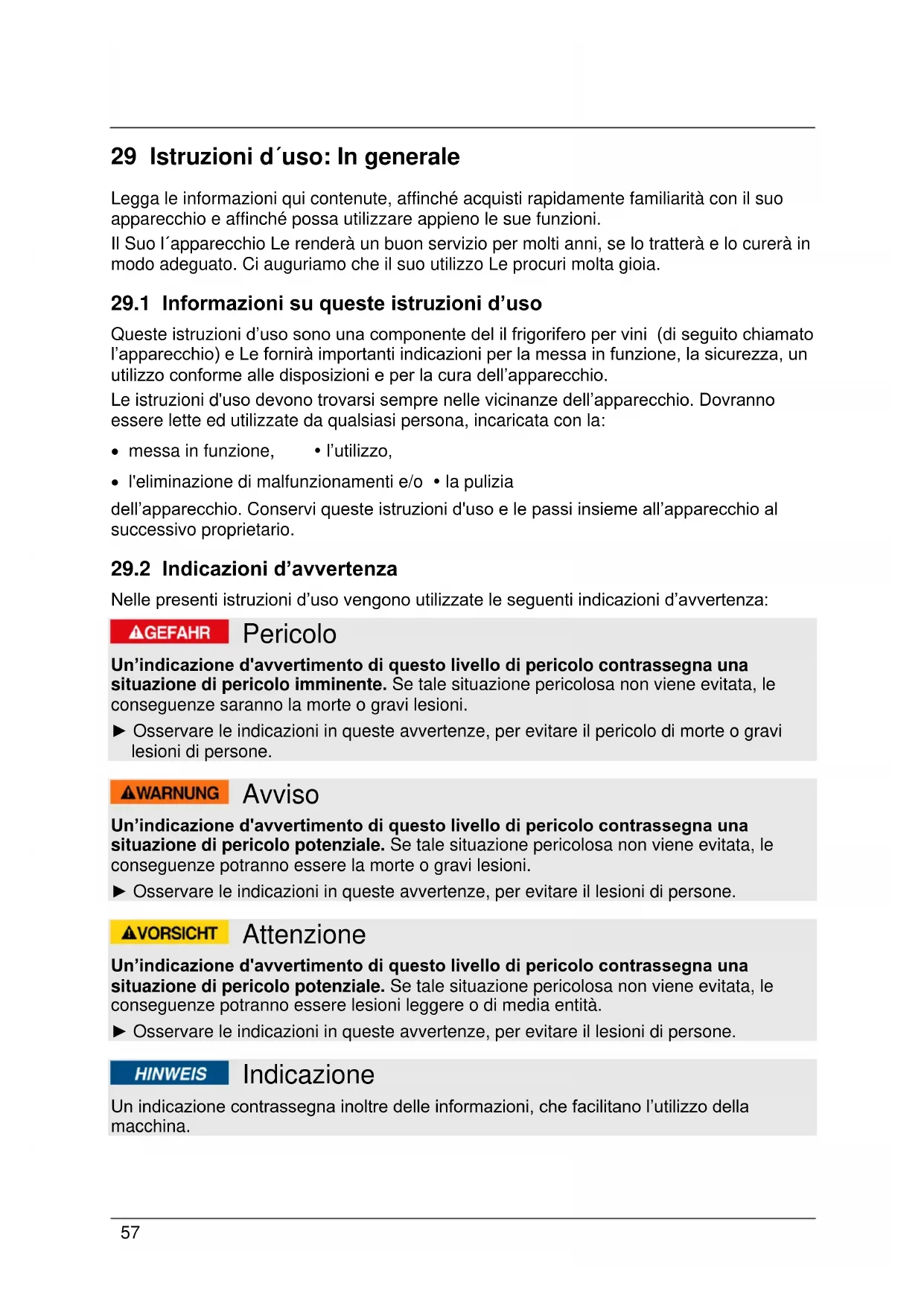 Nelle presenti istruzioni d’uso vengono utilizzate le seguenti indicazioni d’avvertenza: Pericolo Un’indicazione d'avvertimento di questo livello di pericolo contrassegna una situazione di pericolo imminente. Se tale situazione pericolosa non viene evitata, le conseguenze saranno la morte o gravi lesioni. ► Osservare le indicazioni in queste avvertenze, per evitare il pericolo di morte o gravi lesioni di persone. Avviso Un’indicazione d'avvertimento di questo livello di pericolo contrassegna una situazione di pericolo potenziale. Se tale situazione pericolosa non viene evitata, le conseguenze potranno essere la morte o gravi lesioni. ► Osservare le indicazioni in queste avvertenze, per evitare il lesioni di persone. Attenzione Un’indicazione d'avvertimento di questo livello di pericolo contrassegna una situazione di pericolo potenziale. Se tale situazione pericolosa non viene evitata, le conseguenze potranno essere lesioni leggere o di media entità. ► Osservare le indicazioni in queste avvertenze, per evitare il lesioni di persone. Indicazione Un indicazione contrassegna inoltre delle informazioni, che facilitano l’utilizzo della macchina.58