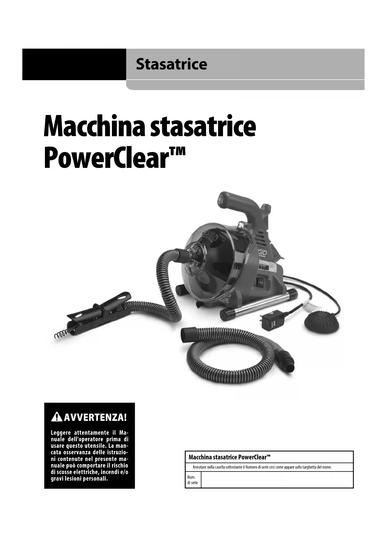 PowerClear™-afvoerontstoppingsmachineMacchina stasatrice PowerClear™ Stasatrice Macchina stasatrice PowerClear™ Annotare nella casella sottostante il Numero di serie così come appare sulla targhetta del nome. Num. di serie AVVERTENZA! Leggere attentamente il Ma- nuale dell'operatore prima di usare questo utensile. La man- cata osservanza delle istruzio- ni contenute nel presente ma- nuale può comportare il rischio di scosse elettriche, incendi e/o gravi lesioni personali.999-995-082.09_REV D Indice Modulo per la registrazione del Numero di serie del prodotto 87 Dichiarazione di conformità CE Coperchio posteriore interno Garanzia a vita Quarta di copertina *Traduzione delle istruzioni originali Simboli di sicurezza