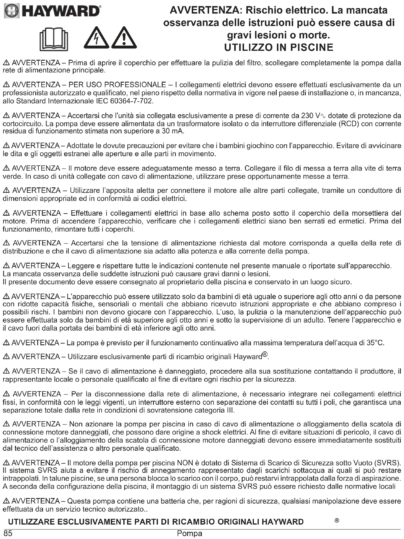 - AVVERTENZA – Utilizzare esclusivamente parti di ricambio originali Hayward