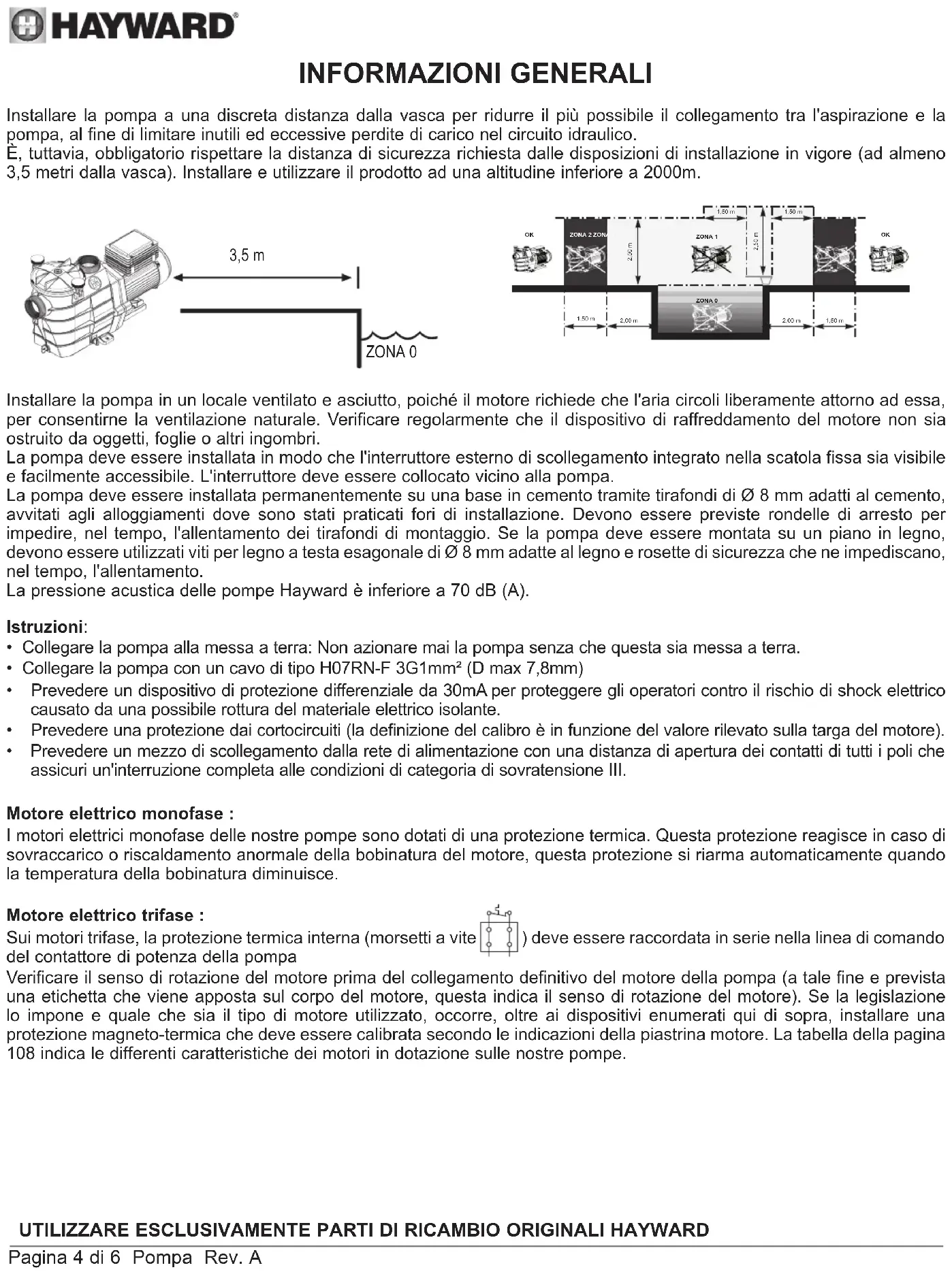 Dati da conservare Nota REGISTRAZIONEUTILIZZARE ESCLUSIVAMENTE PARTI DI RICAMBIO ORIGINALI HAYWARD Pagina 4 di 6 Pompa Rev. A INFORMAZIONI GENERALI Installare la pompa a una discreta distanza dalla vasca per ridurre il più possibile il collegamento tra l'aspirazione e la pompa, al fine di limitare inutili ed eccessive perdite di carico nel circuito idraulico. È, tuttavia, obbligatorio rispettare la distanza di sicurezza richiesta dalle disposizioni di installazione in vigore (ad almeno 3,5 metri dalla vasca). Installare e utilizzare il prodotto ad una altitudine inferiore a 2000m. ZONA 2 ZONA 2 ZONA 0 1,50 m 2,50 m 2,50 m 1,50 m 2,00 m 2,00 m 1,50 m ZONA 1 1,50 m