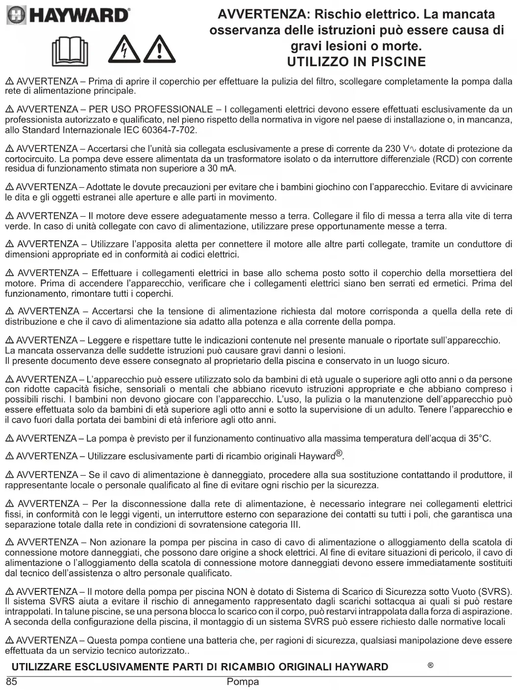 - AVVERTENZA – Utilizzare esclusivamente parti di ricambio originali Hayward