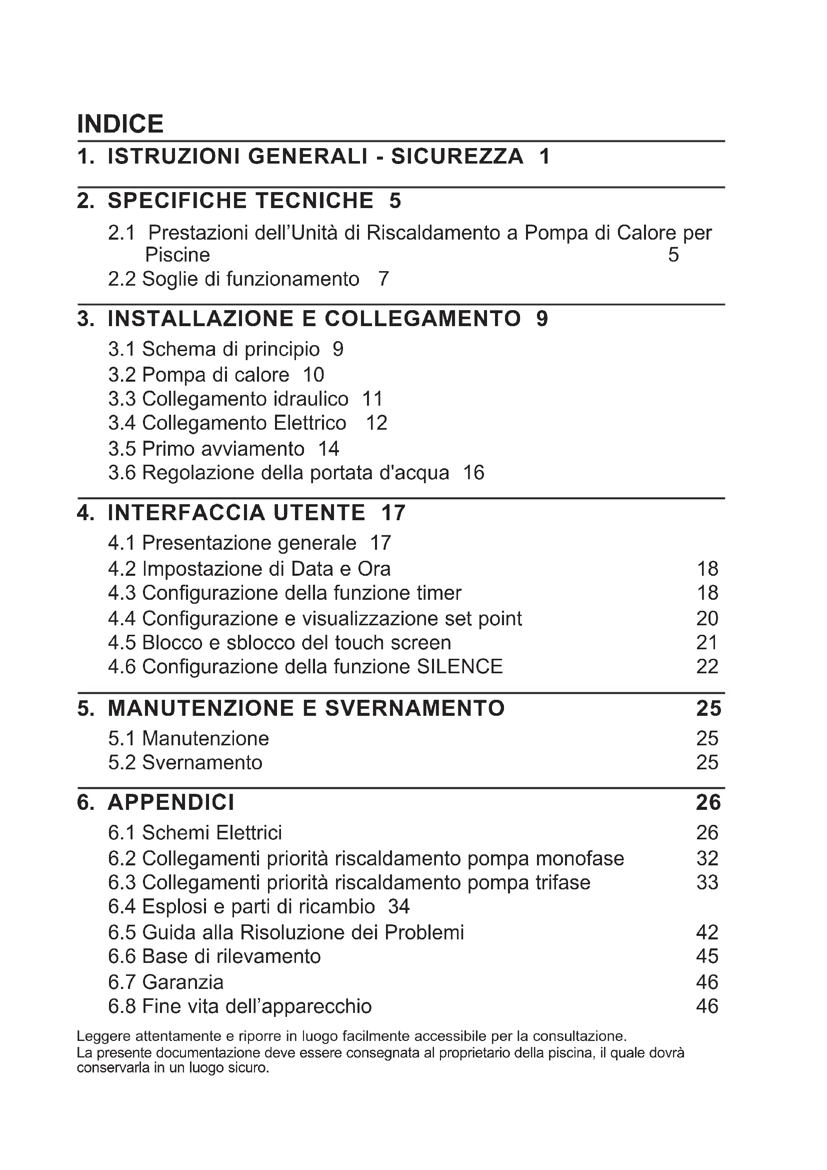Vi ringraziamo per aver acquistato la nostra pompa a calore per piscina Hayward. La pompa a calore Hayward SUMHEAT FULL INVERTER è stata appositamente studiata secondo severe norme di fabbricazione, allo scopo di fornire il più elevato livello di qualità possibile. Le pompe a calore Hayward vi offriranno eccezionali prestazioni durante tutta la stagione dei bagni adattando la potenza, i consumi elettrici ed il livello acustico alle esigenze di riscaldamento della vostra piscina, grazie al circuito logico di controllo FULL INVERTER. Leggere attentamente le istruzioni contenute in questo manuale prima dell’uso Il presente manuale contiene tutte le informazioni necessarie riguardo all’installazione, alla risoluzione delle anomalie e alla manutenzione della pompa. Leggere attentamente il manuale prima di aprire la pompa o di effettuare operazioni di manutenzione sulla stessa. Il costruttore della pompa non sarà ritenuto in alcun caso responsabile di eventuali danni fisici subiti da un utente o di eventuali danni subiti dal materiale in seguito ad errori d’installazione, a tentativi di risoluzione di anomalie o ad interventi di manutenzione inutili. Vanno sempre rispettate le istruzioni contenute nel manuale Dopo aver letto il presente manuale, riporlo in luogo facilmente accessibile per la consultazione. Personale abilitato