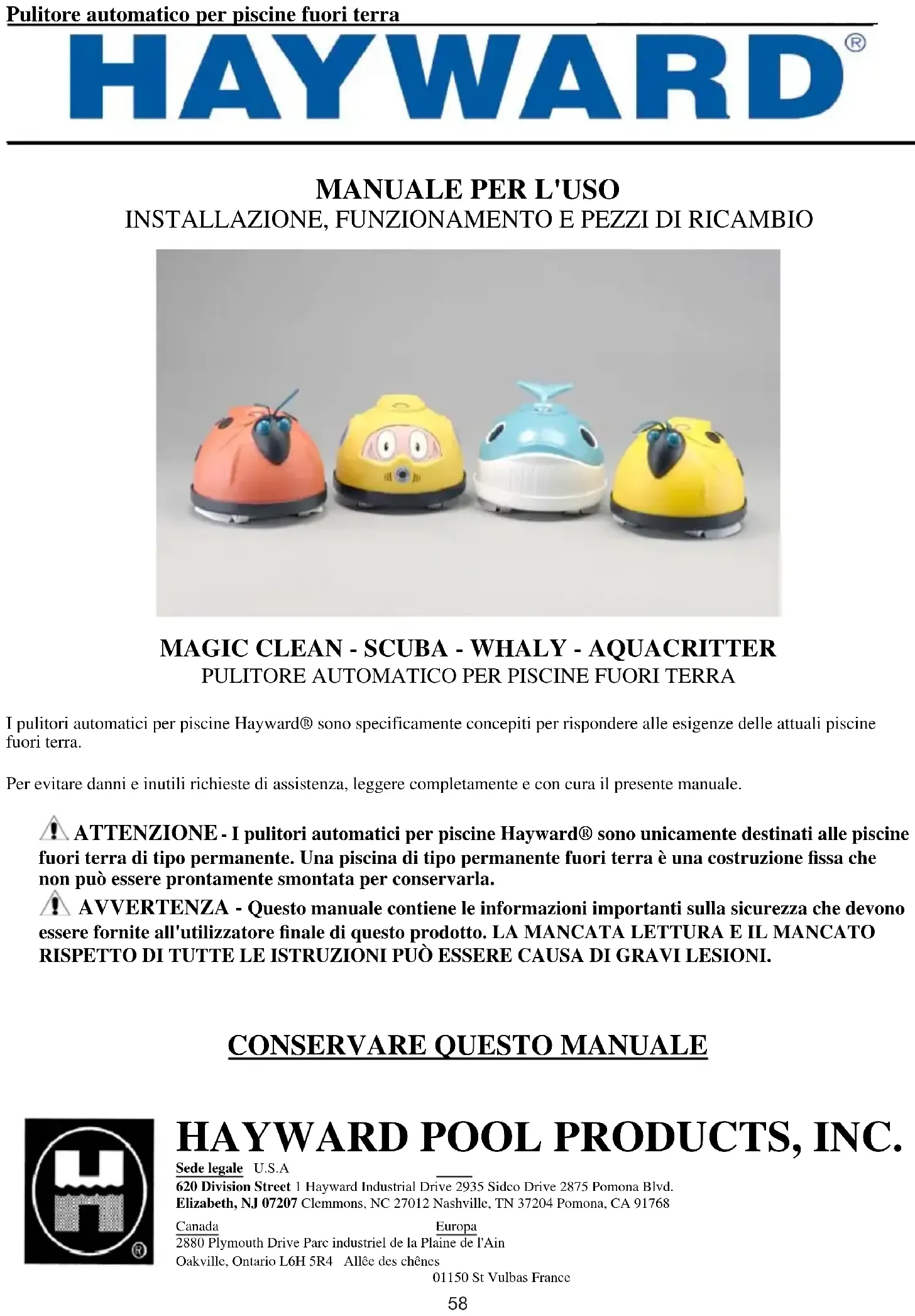 I pulitori automatici per piscine Hayward® sono specificamente concepiti per rispondere alle esigenze delle attuali piscine fuori terra.Per evitare danni e inutili richieste di assistenza, leggere completamente e con cura il presente manuale. ATTENZIONE- I pulitori automatici per piscine Hayward® sono unicamente destinati alle piscine fuori terra di tipo permanente. Una piscina di tipo permanente fuori terra è una costruzione fissa che non può essere prontamente smontata per conservarla. AVVERTENZA - Questo manuale contiene le informazioni importanti sulla sicurezza che devono essere fornite all'utilizzatore finale di questo prodotto. LA MANCATA LETTURA E IL MANCATO RISPETTO DI TUTTE LE ISTRUZIONI PUÒ ESSERE CAUSA DI GRAVI LESIONI.