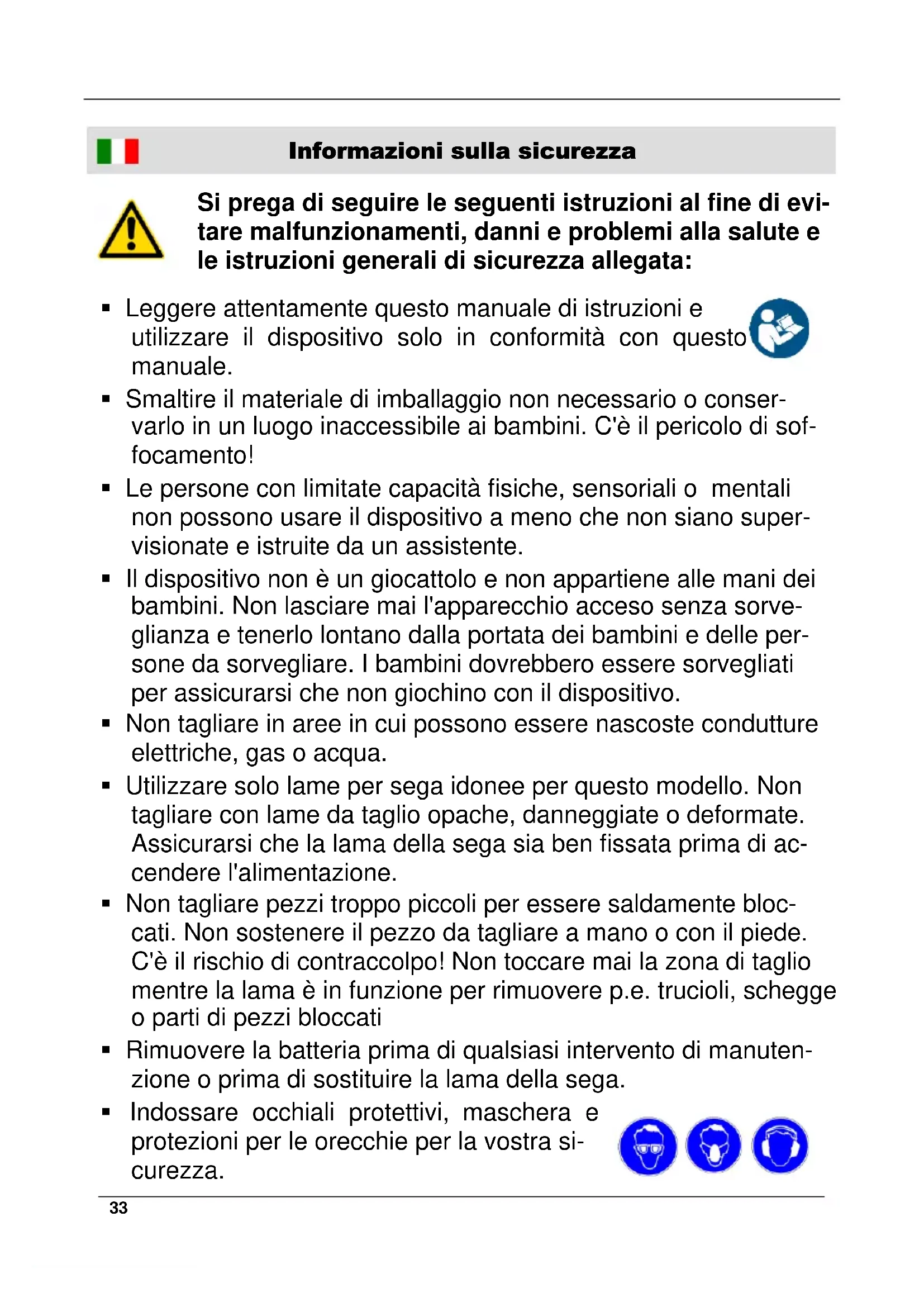 Batteries n'appartiennent pas à la poubelle. Vous pouvez le charger de nouveau à nous En- voyer ou livrer dans les magasins locaux ou des points de collecte des piles.33 Informazioni sulla sicurezza Leggere attentamente questo manuale di istruzioni e utilizzare il dispositivo solo in conformità con questo manuale. Smaltire il materiale di imballaggio non necessario o conser- varlo in un luogo inaccessibile ai bambini. C'è il pericolo di sof- focamento! Le persone con limitate capacità fisiche, sensoriali o mentali non possono usare il dispositivo a meno che non siano super- visionate e istruite da un assistente. Il dispositivo non è un giocattolo e non appartiene alle mani dei bambini. Non lasciare mai l'apparecchio acceso senza sorve- glianza e tenerlo lontano dalla portata dei bambini e delle per- sone da sorvegliare. I bambini dovrebbero essere sorvegliati per assicurarsi che non giochino con il dispositivo. Non tagliare in aree in cui possono essere nascoste condutture elettriche, gas o acqua. Utilizzare solo lame per sega idonee per questo modello. Non tagliare con lame da taglio opache, danneggiate o deformate. Assicurarsi che la lama della sega sia ben fissata prima di ac- cendere l'alimentazione. Non tagliare pezzi troppo piccoli per essere saldamente bloc- cati. Non sostenere il pezzo da tagliare a mano o con il piede. C'è il rischio di contraccolpo! Non toccare mai la zona di taglio mentre la lama è in funzione per rimuovere p.e. trucioli, schegge o parti di pezzi bloccati Rimuovere la batteria prima di qualsiasi intervento di manuten- zione o prima di sostituire la lama della sega. Indossare occhiali protettivi, maschera e protezioni per le orecchie per la vostra si- curezza.