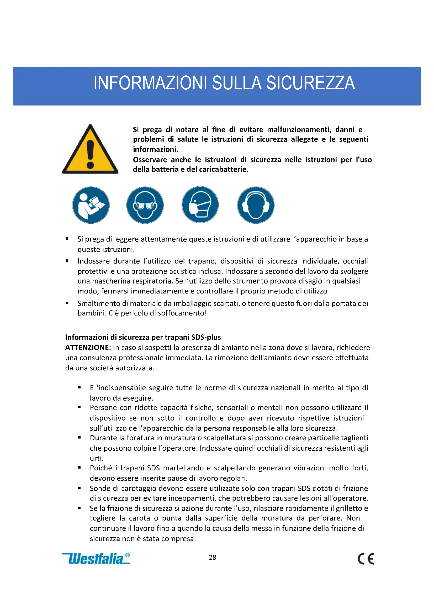 - Smaltimento di materiale da imballaggio scartati, o tenere questo fuori dalla portata dei bambini. C'è pericolo di soffocamento! Informazioni di sicurezza per trapani SDS-plus ATTENZIONE: In caso si sospetti la presenza di amianto nella zona dove si lavora, richiedere una consulenza professionale immediata. La rimozione dell'amianto deve essere effettuata da una società autorizzata.
