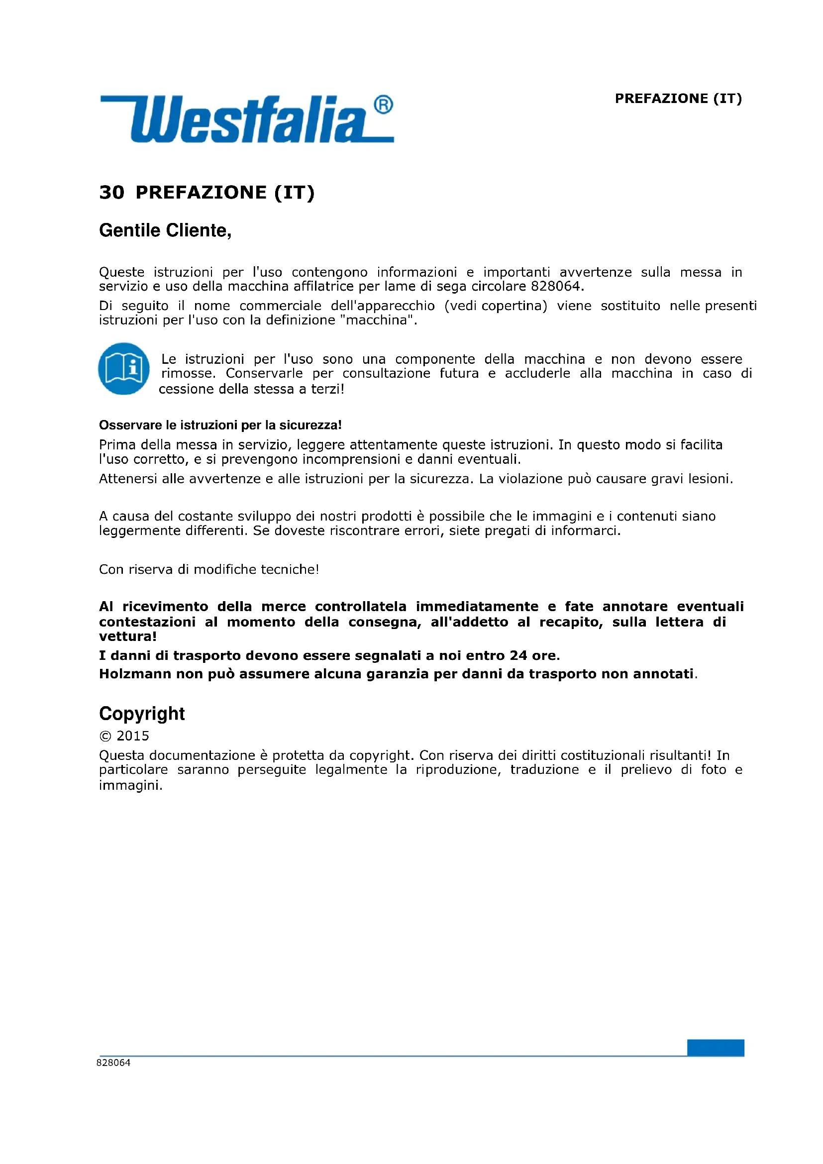 30 PREFAZIONE (IT) Gentile Cliente, Queste istruzioni per l'uso contengono informazioni e importanti avvertenze sulla messa in servizio e uso della macchina affilatrice per lame di sega circolare 828064. Di seguito il nome commerciale dell'apparecchio (vedi copertina) viene sostituito nelle presenti istruzioni per l'uso con la definizione "macchina". Le istruzioni per l'uso sono una componente della macchina e non devono essere rimosse. Conservarle per consultazione futura e accluderle alla macchina in caso di cessione della stessa a terzi! Osservare le istruzioni per la sicurezza! Prima della messa in servizio, leggere attentamente queste istruzioni. In questo modo si facilita l'uso corretto, e si prevengono incomprensioni e danni eventuali. Attenersi alle avvertenze e alle istruzioni per la sicurezza. La violazione può causare gravi lesioni. A causa del costante sviluppo dei nostri prodotti è possibile che le immagini e i contenuti siano leggermente differenti. Se doveste riscontrare errori, siete pregati di informarci. Con riserva di modifiche tecniche! Al ricevimento della merce controllatela immediatamente e fate annotare eventuali contestazioni al momento della consegna, all'addetto al recapito, sulla lettera di vettura! I danni di trasporto devono essere segnalati a noi entro 24 ore. Holzmann non può assumere alcuna garanzia per danni da trasporto non annotati. Copyright © 2015 Questa documentazione è protetta da copyright. Con riserva dei diritti costituzionali risultanti! In particolare saranno perseguite legalmente la riproduzione, traduzione e il prelievo di foto e immagini.SICUREZZA