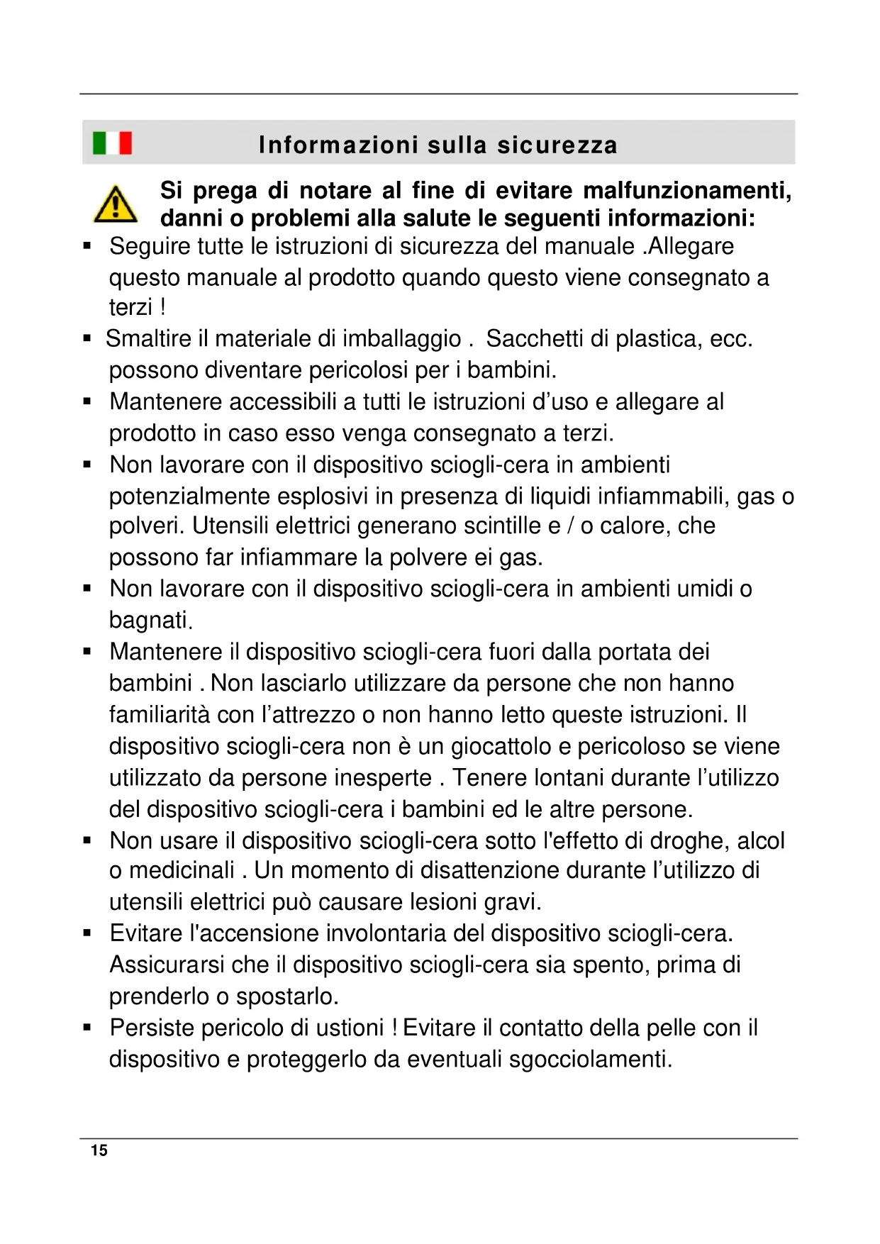 Mantenere il dispositivo sciogli-cera fuori dalla portata dei bambini . Non lasciarlo utilizzare da persone che non hanno familiarità con l’attrezzo o non hanno letto queste istruzioni. Il dispositivo sciogli-cera non è un giocattolo e pericoloso se viene utilizzato da persone inesperte . Tenere lontani durante l’utilizzo del dispositivo sciogli-cera i bambini ed le altre persone. Non usare il dispositivo sciogli-cera sotto l'effetto di droghe, alcol o medicinali . Un momento di disattenzione durante l’utilizzo di utensili elettrici può causare lesioni gravi. Evitare l'accensione involontaria del dispositivo sciogli-cera. Assicurarsi che il dispositivo sciogli-cera sia spento, prima di prenderlo o spostarlo. Persiste pericolo di ustioni ! Evitare il contatto della pelle con il dispositivo e proteggerlo da eventuali sgocciolamenti.