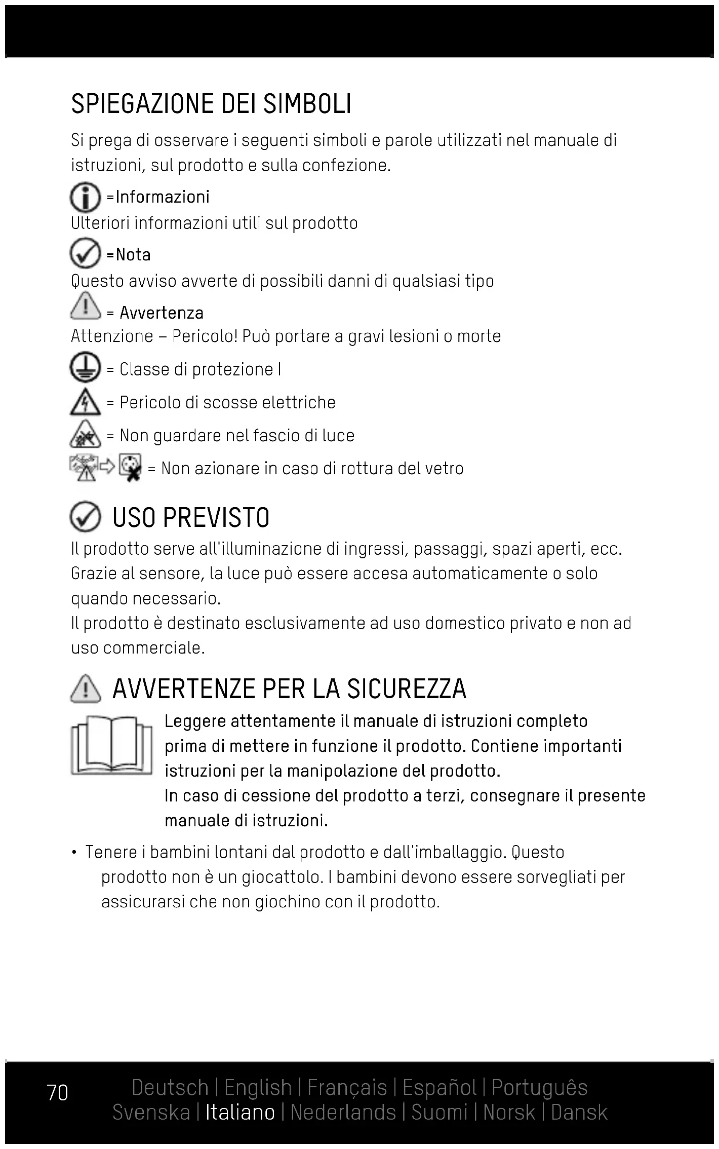 Si prega di osservare i seguenti simboli e parole utilizzati nel manuale di istruzioni, sul prodotto e sulla confezione. =Informazioni Ulteriori informazioni utili sul prodotto =Nota Questo avviso avverte di possibili danni di qualsiasi tipo = Avvertenza Attenzione – Pericolo! Può portare a gravi lesioni o morte = Classe di protezione I = Pericolo di scosse elettriche = Non guardare nel fascio di luce = Non azionare in caso di rottura del vetro USO PREVISTO Il prodotto serve all'illuminazione di ingressi, passaggi, spazi aperti, ecc. Grazie al sensore, la luce può essere accesa automaticamente o solo quando necessario. Il prodotto è destinato esclusivamente ad uso domestico privato e non ad uso commerciale.