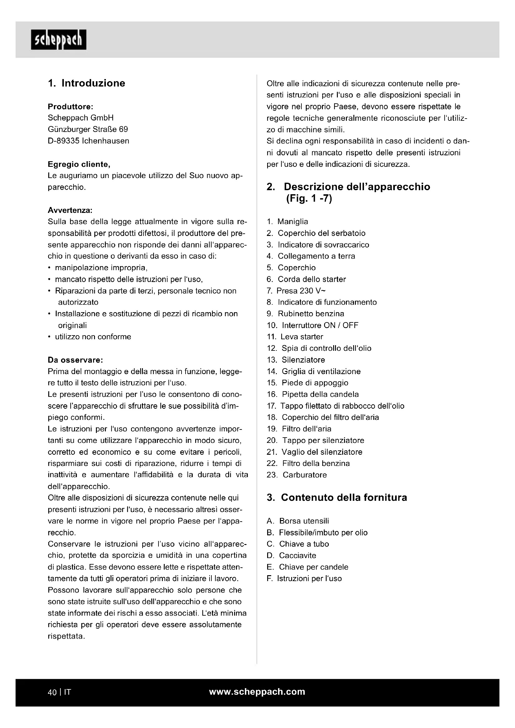 Produttore: Scheppach GmbH Günzburger Straße 69 D-89335 Ichenhausen Egregio cliente, Le auguriamo un piacevole utilizzo del Suo nuovo ap- parecchio. Avvertenza: Sulla base della legge attualmente in vigore sulla re- sponsabilità per prodotti difettosi, il produttore del pre- sente apparecchio non risponde dei danni all‘apparec- chio in questione o derivanti da esso in caso di:
