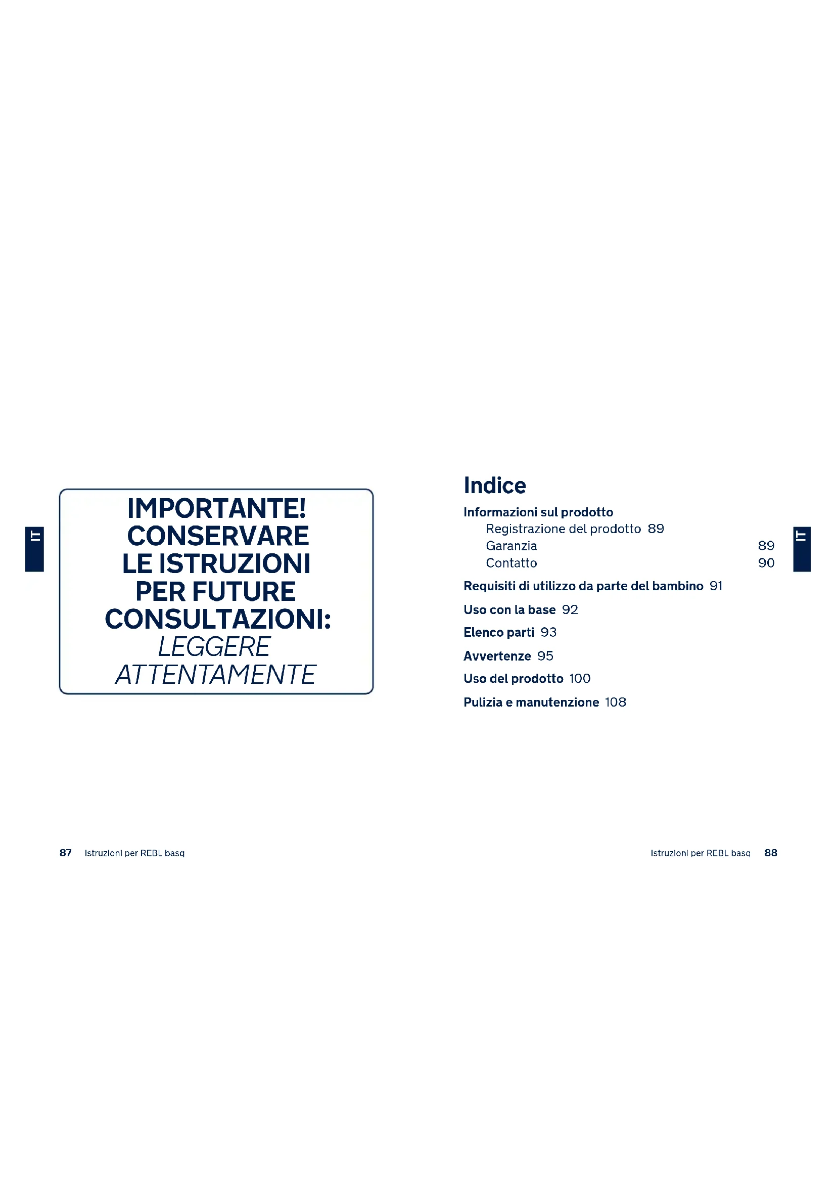 Indice Informazioni sul prodotto Registrazione del prodotto 89 Garanzia 89 Contatto 90 Requisiti di utilizzo da parte del bambino 91 Uso con la base 92 Elenco parti 93 Avvertenze 95 Uso del prodotto 100 Pulizia e manutenzione 108 IMPORTANTE! CONSERVARE LE ISTRUZIONI PER FUTURE CONSULTAZIONI: LEGGERE ATTENTAMENTE9089 Istruzioni per REBL basq Istruzioni per REBL basq