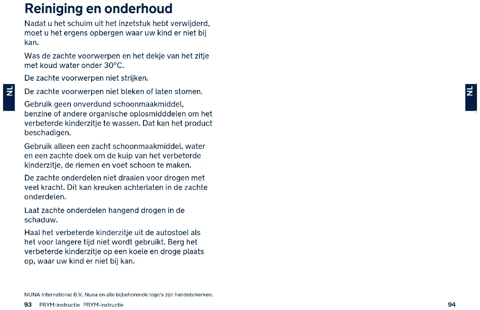 Pulizia e manutenzione Dopo aver rimosso il fermo dall'inserto, conservarlo lontano dalla portata dei bambini. Lavare l'imbottitura e la fodera con acqua fredda sotto i 30°C. Non stirare il rivestimento imbottito. Non candeggiare e non lavare a secco il rivestimento imbottito. Non usare un detergente non diluito, benzina o altri solventi organici per lavare il sistema di ritenuta per bambini migliorato. Potrebbe danneggiare il prodotto. Utilizzare solo un detergente neutro, acqua e un panno morbido per pulire la scocca e le bretelle del sistema di ritenuta per bambini migliorato. Non attorcigliare il rivestimento imbottito per asciugare con grande forza. Si potrebbero lasciare grinze sul rivestimento imbottito. Appendere il rivestimento imbottito all'ombra per asciugare. Rimuovere il sistema di ritenuta per bambini migliorato dal sedile del veicolo se non viene usato per un lungo periodo di tempo. Sistemare il sistema di ritenuta per bambini migliorato in un luogo fresco e asciutto e inaccessibile al bambino. NUNA International B.V. Nuna e tutti i logo associati sono marchi di fabbrica.120119 Instrucciones del PRYM Instrucciones del PRYM