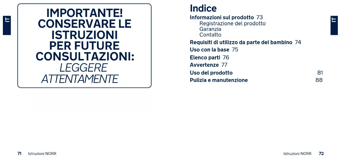 NLIMPORTANTE! CONSERVARE LE ISTRUZIONI PER FUTURE CONSULTAZIONI: LEGGERE ATTENTAMENTE Indice Informazioni sul prodotto 73 Registrazione del prodotto Garanzia Contatto Requisiti di utilizzo da parte del bambino 74 Uso con la base 75 Elenco parti 76 Avvertenze 77 Uso del prodotto 81 Pulizia e manutenzione 88