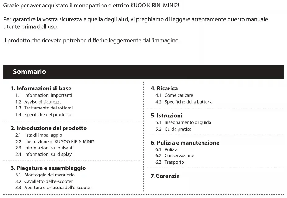 7.Garanzia SommarioData di acquisto: Codice scooter: Capitolo 1 Informazioni di base Questo manuale vi guiderà nell'apprendimento delle funzioni, dell'uso e della manutenzione di KUGOO KIRIN MINi2. Si prega di tenere pronte le informazioni relative all'acquisto prima di contattare il servizio clienti, in quanto tali informazioni potrebbero essere richieste durante il processo di comunicazione. Si prega di osservare tutte le avvertenze di sicurezza contenute in questo manuale durante l'uso. Si prega di leggere questo manuale prima dell'uso.