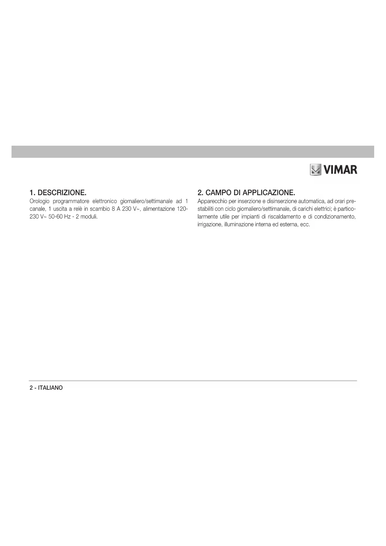 Apparecchio per inserzione e disinserzione automatica, ad orari pre- stabiliti con ciclo giornaliero/settimanale, di carichi elettrici; è partico- larmente utile per impianti di riscaldamento e di condizionamento, irrigazione, illuminazione interna ed esterna, ecc.ITALIANO - 3