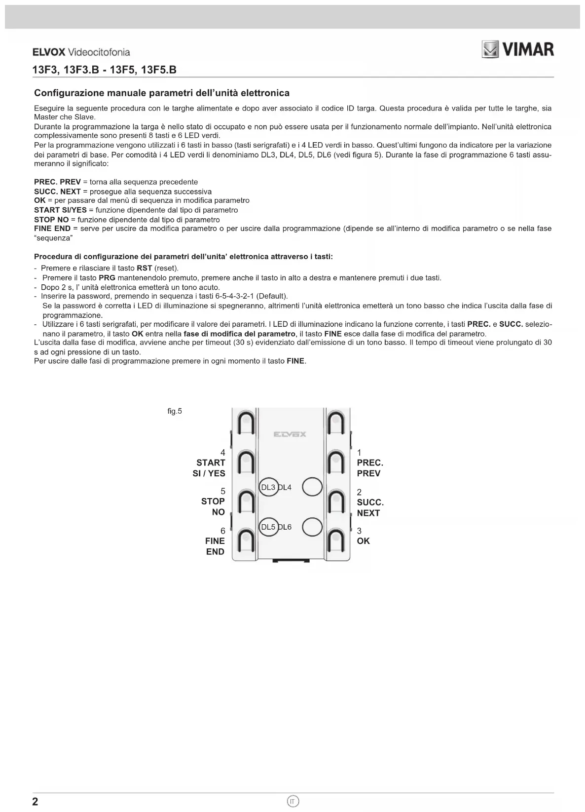 Manuale di programmazione - Programming manual Manuel de programmation - Programmieranleitung Manual de programación - Manual de programação Εγχειρίδιο προγραμματισμούConfigurazione manuale parametri dell’unità elettronica Eseguire la seguente procedura con le targhe alimentate e dopo aver associato il codice ID targa. Questa procedura è valida per tutte le targhe, sia Master che Slave. Durante la programmazione la targa è nello stato di occupato e non può essere usata per il funzionamento normale dell’impianto. Nell’unità elettronica complessivamente sono presenti 8 tasti e 6 LED verdi. Per la programmazione vengono utilizzati i 6 tasti in basso (tasti serigrafati) e i 4 LED verdi in basso. Quest’ultimi fungono da indicatore per la variazione dei parametri di base. Per comodità i 4 LED verdi li denominiamo DL3, DL4, DL5, DL6 (vedi figura 5). Durante la fase di programmazione 6 tasti assu- meranno il significato: PREC. PREV = torna alla sequenza precedente SUCC. NEXT = prosegue alla sequenza successiva OK = per passare dal menù di sequenza in modifica parametro START SI/YES = funzione dipendente dal tipo di parametro STOP NO = funzione dipendente dal tipo di parametro FINE END = serve per uscire da modifica parametro o per uscire dalla programmazione (dipende se all’interno di modifica parametro o se nella fase “sequenza” Procedura di configurazione dei parametri dell’unita’ elettronica attraverso i tasti: - Premere e rilasciare il tasto RST (reset). - Premere il tasto PRG mantenendolo premuto, premere anche il tasto in alto a destra e mantenere premuti i due tasti. - Dopo 2 s, l’ unità elettronica emetterà un tono acuto. - Inserire la password, premendo in sequenza i tasti 6-5-4-3-2-1 (Default). Se la password è corretta i LED di illuminazione si spegneranno, altrimenti l’unità elettronica emetterà un tono basso che indica l’uscita dalla fase di programmazione. - Utilizzare i 6 tasti serigrafati, per modificare il valore dei parametri. I LED di illuminazione indicano la funzione corrente, i tasti PREC. e SUCC. selezio- nano il parametro, il tasto OK entra nella fase di modifica del parametro, il tasto FINE esce dalla fase di modifica del parametro. L’uscita dalla fase di modifica, avviene anche per timeout (30 s) evidenziato dall’emissione di un tono basso. Il tempo di timeout viene prolungato di 30 s ad ogni pressione di un tasto. Per uscire dalle fasi di programmazione premere in ogni momento il tasto FINE. g.5