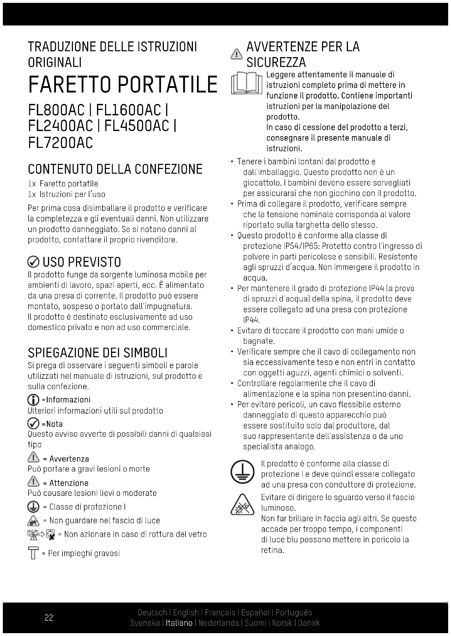 DATI TECNICI Modello 1600-0277: FL800AC 1600-0278: FL1600AC 1600-0279: FL2400AC 1600-0403: FL4500AC 1600-0404: FL7200AC Tensione di alimentazione 230 V~, 50/60 Hz 220-240 V~, 50/60 Hz Potenza in watt 10 W 20 W 30 W 50W 80W Protezione IP IP54 (resistente agli spruzzi d’acqua) IP65 Protezione IK IK05 Protezione IP (spina) IP44 (resistente agli spruzzi d’acqua) Classe di protezione I Tipo di lampada LED Temperatura di colore 5000 K Indice di resa cromatica (CRI) >80 Ra Flusso luminoso nominale 900 lm 1800 lm 2700 lm 4500lm 7200lm Superficie massima di proiezione 454 cm
