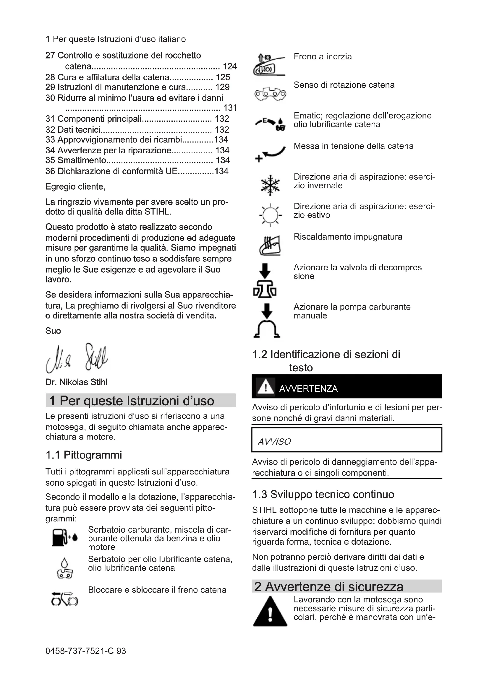 STIHL sottopone tutte le macchine e le apparec‐ chiature a un continuo sviluppo; dobbiamo quindi riservarci modifiche di fornitura per quanto riguarda forma, tecnica e dotazione. Non potranno perciò derivare diritti dai dati e dalle illustrazioni di queste Istruzioni d’uso. 2 Avvertenze di sicurezza Lavorando con la motosega sono necessarie misure di sicurezza parti‐ colari, perché è manovrata con un’e‐ 1 Per queste Istruzioni d’uso italiano 0458-737-7521-C 93levata velocità della catena, i cui denti sono molto affilati. Non mettere in funzione per la prima volta senza avere letto attentamente e per intero le Istruzioni d’uso; con‐ servarle con cura per la successiva consultazione. L’inosservanza delle Istruzioni d’uso può comportare rischi mortali.