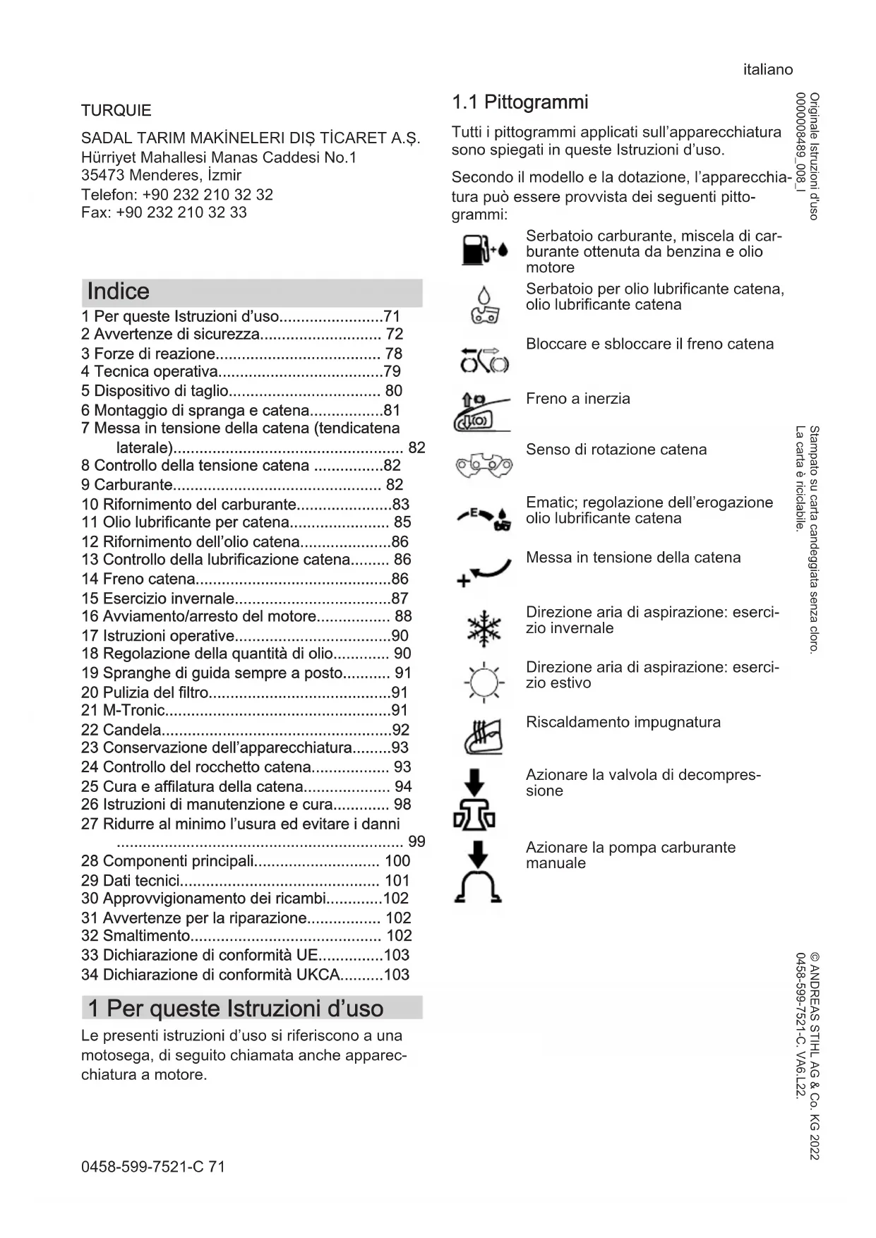 - 34 Dichiarazione di conformità UKCA 1 Per queste Istruzioni d’uso Le presenti istruzioni d’uso si riferiscono a una motosega, di seguito chiamata anche apparec‐ chiatura a motore. p. 103