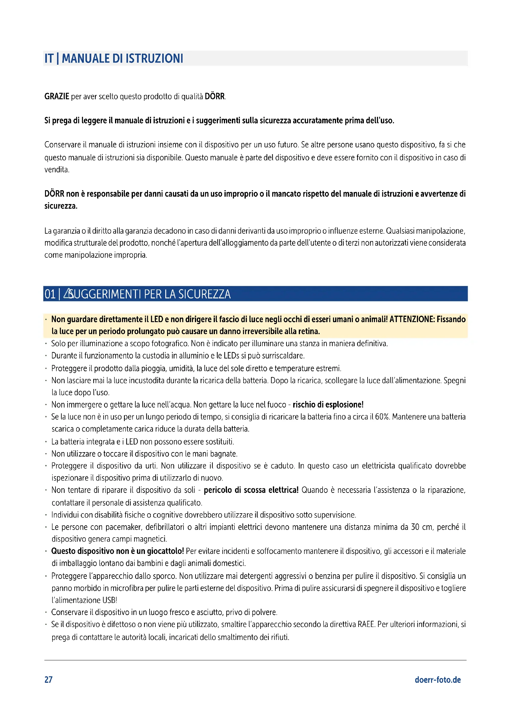 GRAZIE per aver scelto questo prodotto di qualità DÖRR. Si prega di leggere il manuale di istruzioni e i suggerimenti sulla sicurezza accuratamente prima dell'uso. Conservare il manuale di istruzioni insieme con il dispositivo per un uso futuro. Se altre persone usano questo dispositivo, fa si che questo manuale di istruzioni sia disponibile. Questo manuale è parte del dispositivo e deve essere fornito con il dispositivo in caso di vendita. DÖRR non è responsabile per danni causati da un uso improprio o il mancato rispetto del manuale di istruzioni e avvertenze di sicurezza. La garanzia o il diritto alla garanzia decadono in caso di danni derivanti da uso improprio o influenze esterne. Qualsiasi manipolazione, modifica strutturale del prodotto, nonché l'apertura dell'alloggiamento da parte dell'utente o di terzi non autorizzati viene considerata come manipolazione impropria.