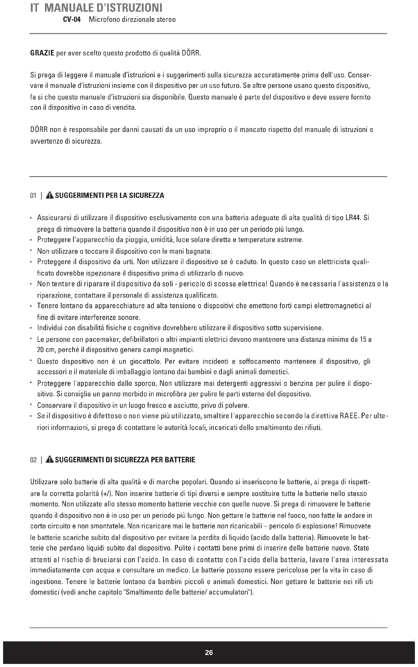 CV-04 Microfono direzionale stereo GRAZIE per aver scelto questo prodotto di qualità DÖRR. Si prega di leggere il manuale d’istruzioni e i suggerimenti sulla sicurezza accuratamente prima dell'uso. Conser- vare il manuale d’istruzioni insieme con il dispositivo per un uso futuro. Se altre persone usano questo dispositivo, fa si che questo manuale d’istruzioni sia disponibile. Questo manuale è parte del dispositivo e deve essere fornito con il dispositivo in caso di vendita. DÖRR non è responsabile per danni causati da un uso improprio o il mancato rispetto del manuale di istruzioni e avvertenze di sicurezza. 01 |
