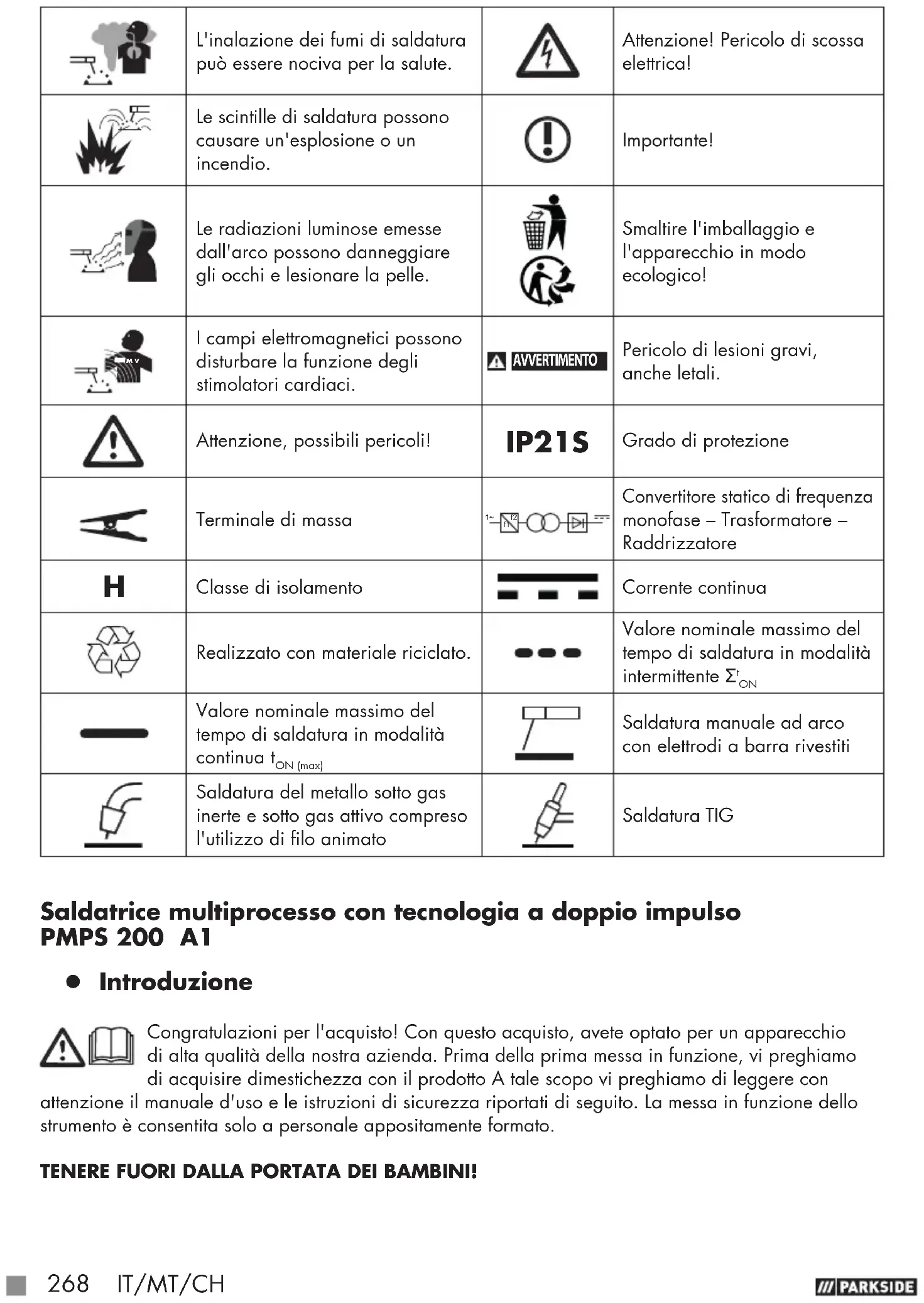 Valore nominale massimo del tempo di saldatura in modalità continua t ON (max) Saldatura manuale ad arco con elettrodi a barra rivestiti Saldatura del metallo sotto gas inerte e sotto gas attivo compreso l'utilizzo di filo animato Saldatura TIG Saldatrice multiprocesso con tecnologia a doppio impulso PMPS200 A1 z Introduzione Congratulazioni per l'acquisto! Con questo acquisto, avete optato per un apparecchio di alta qualità della nostra azienda. Prima della prima messa in funzione, vi preghiamo di acquisire dimestichezza con il prodotto A tale scopo vi preghiamo di leggere con attenzione il manuale d'uso e le istruzioni di sicurezza riportati di seguito. La messa in funzione dello strumento è consentita solo a personale appositamente formato. TENERE FUORI DALLA PORTATA DEI BAMBINI!IT/MT/CH