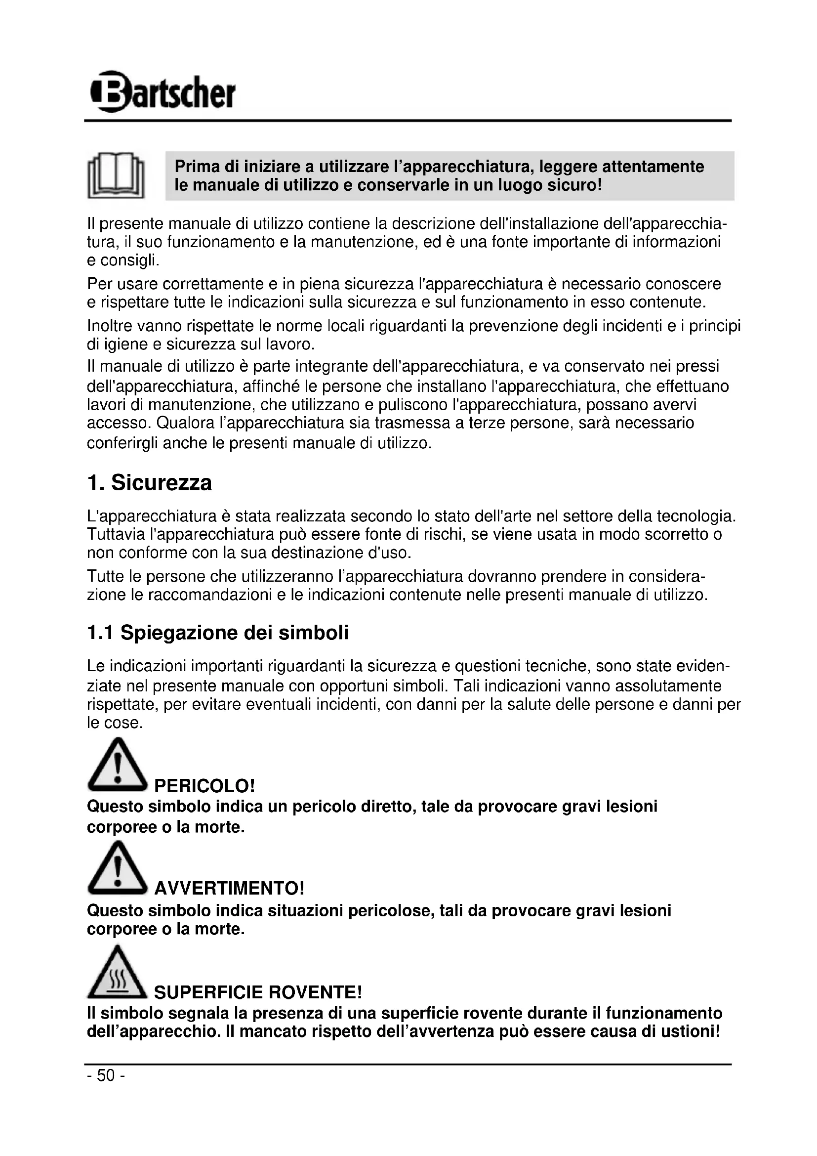 Le indicazioni importanti riguardanti la sicurezza e questioni tecniche, sono state eviden- ziate nel presente manuale con opportuni simboli. Tali indicazioni vanno assolutamente rispettate, per evitare eventuali incidenti, con danni per la salute delle persone e danni per le cose. PERICOLO! Questo simbolo indica un pericolo diretto, tale da provocare gravi lesioni corporee o la morte. AVVERTIMENTO! Questo simbolo indica situazioni pericolose, tali da provocare gravi lesioni corporee o la morte. SUPERFICIE ROVENTE! Il simbolo segnala la presenza di una superficie rovente durante il funzionamento dell’apparecchio. Il mancato rispetto dell’avvertenza può essere causa di ustioni!- 51 - PRUDENZA! Questo simbolo indica la possibile comparsa di situazioni pericolose, tali da provocare lesioni leggere, il danneggiamento, il malfunzionamento e/ o la rottura dell'apparecchiatura. INDICAZIONE! Questo simbolo indica i consigli e le informazioni a cui attenersi per garantire un utilizzo dell'apparecchiatura privo di problemi ed efficace.
