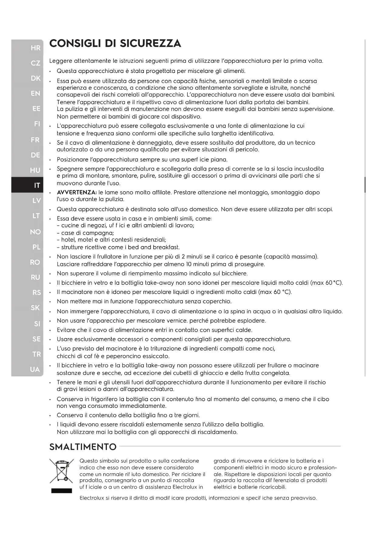 Questa apparecchiatura è stata progettata per miscelare gli alimenti. Essa può essere utilizzata da persone con capacità fisiche, sensoriali o mentali limitate o scarsa esperienza e conoscenza, a condizione che siano attentamente sorvegliate e istruite, nonché consapevoli dei rischi correlati all’apparecchio. L’apparecchiatura non deve essere usata dai bambini. Tenere l’apparecchiatura e il rispettivo cavo di alimentazione fuori dalla portata dei bambini. La pulizia e gli interventi di manutenzione non devono essere eseguiti dai bambini senza supervisione. Non permettere ai bambini di giocare col dispositivo. L'apparecchiatura può essere collegata esclusivamente a una fonte di alimentazione la cui tensione e frequenza siano conformi alle specif iche sulla targhetta identif icativa. Se il cavo di alimentazione è danneggiato, deve essere sostituito dal produttore, da un tecnico autorizzato o da una persona qualificata per evitare situazioni di pericolo. Posizionare l’apparecchiatura sempre su una superf icie piana. Spegnere sempre l'apparecchiatura e scollegarla dalla presa di corrente se la si lascia incustodita e prima di montare, smontare, pulire, sostituire gli accessori o prima di avvicinarsi alle parti che si muovono durante l'uso. AVVERTENZA: le lame sono molto af f ilate. Prestare attenzione nel montaggio, smontaggio dopo l'uso o durante la pulizia. Questa apparecchiatura è destinata solo all'uso domestico. Non deve essere utilizzata per altri scopi. Essa deve essere usata in casa e in ambienti simili, come: – cucine di negozi, uf f ici e altri ambienti di lavoro; – case di campagna; – hotel, motel e altri contesti residenziali; – strutture ricettive come i bed and breakfast. Non lasciare il frullatore in funzione per più di 2 minuti se il carico è pesante (capacità massima). Lasciare raf freddare l’apparecchio per almeno 10 minuti prima di proseguire. Non superare il volume di riempimento massimo indicato sul bicchiere. Il bicchiere in vetro e la bottiglia take-away non sono idonei per mescolare liquidi molto caldi (max 60 °C). Il macinatore non è idoneo per mescolare liquidi o ingredienti molto caldi (max 60 °C). Non mettere mai in funzione l'apparecchiatura senza coperchio. Non immergere l'apparecchiatura, il cavo di alimentazione o la spina in acqua o in qualsiasi altro liquido. Non usare l’apparecchio per mescolare vernice. perché potrebbe esplodere. Evitare che il cavo di alimentazione entri in contatto con superfici calde. Usare esclusivamente accessori o componenti consigliati per questa apparecchiatura. L’uso previsto del macinatore è la triturazione di ingredienti compatti come noci, chicchi di caf fè e peperoncino essiccato. Il bicchiere in vetro e la bottiglia take-away non possono essere utilizzati per frullare o macinare sostanze dure e secche, ad eccezione dei cubetti di ghiaccio e della frutta congelata. Tenere le mani e gli utensili fuori dall'apparecchiatura durante il funzionamento per evitare il rischio di gravi lesioni o danni all'apparecchiatura. Conserva in frigorifero la bottiglia con il contenuto fino al momento del consumo, a meno che il cibo non venga consumato immediatamente. Conserva il contenuto della bottiglia fino a tre giorni. I liquidi devono essere riscaldati esternamente senza l’utilizzo della bottiglia. Non utilizzare mai la bottiglia con gli apparecchi di riscaldamento. SMALTIMENTO Electrolux si riserva il diritto di modif icare prodotti, informazioni e specif iche senza preavviso. Questo simbolo sul prodotto o sulla confezione indica che esso non deve essere considerato come un normale rif iuto domestico. Per riciclare il prodotto, consegnarlo a un punto di raccolta uf f iciale o a un centro di assistenza Electrolux in grado di rimuovere e riciclare la batteria e i componenti elettrici in modo sicuro e profession- ale. Rispettare le disposizioni locali per quanto riguarda la raccolta dif ferenziata di prodotti elettrici e batterie ricaricabili.HR