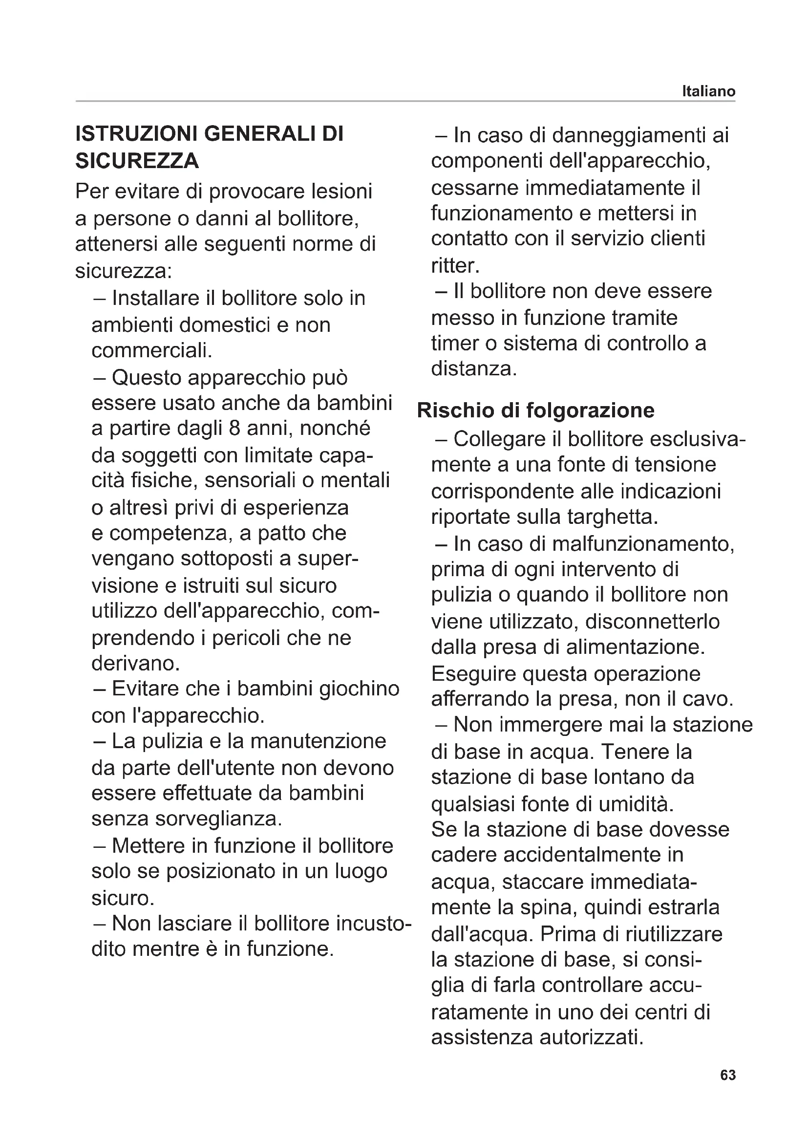 Pericolo di ustione – Durante il processo di riscalda- mento, le superci esterne del recipiente dell'acqua potreb- bero diventare molto calde. Aerrare il bollitore solo utiliz- zando l'impugnatura. – Non aprire mai il coperchio durante il processo di riscalda- mento, poiché potrebbero fuo- riuscire schizzi di acqua calda. L'acqua calda e bollente non- ché il vapore generato potreb- bero provocare gravi ustioni. – Non riempire mai il recipiente dell'acqua oltre il limite mas- simo indicato per evitare la fuoriuscita dell'acqua in ebollizione. – Prima di eettuare le opera- zioni di pulizia, aspettare che il bollitore si rareddi.65 contro il funzionamento a secco, che lo protegge da surriscaldamento quando è vuoto o viene riempito con una quantità di acqua insuciente.