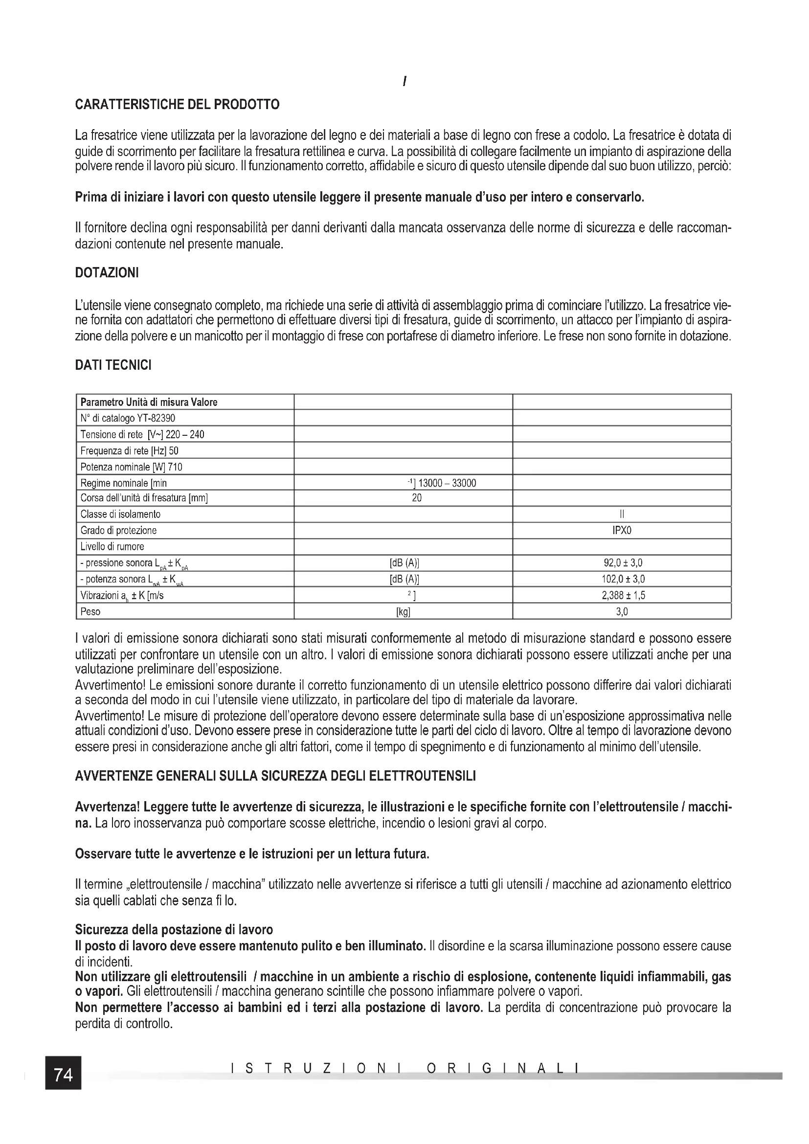 La fresatrice viene utilizzata per la lavorazione del legno e dei materiali a base di legno con frese a codolo. La fresatrice è dotata di guide di scorrimento per facilitare la fresatura rettilinea e curva. La possibilità di collegare facilmente un impianto di aspirazione della polvere rende il lavoro più sicuro. Il funzionamento corretto, affi dabile e sicuro di questo utensile dipende dal suo buon utilizzo, perciò: Prima di iniziare i lavori con questo utensile leggere il presente manuale d’uso per intero e conservarlo. Il fornitore declina ogni responsabilità per danni derivanti dalla mancata osservanza delle norme di sicurezza e delle raccoman- dazioni contenute nel presente manuale. DOTAZIONI L’utensile viene consegnato completo, ma richiede una serie di attività di assemblaggio prima di cominciare l’utilizzo. La fresatrice vie- ne fornita con adattatori che permettono di eff ettuare diversi tipi di fresatura, guide di scorrimento, un attacco per l’impianto di aspira- zione della polvere e un manicotto per il montaggio di frese con portafrese di diametro inferiore. Le frese non sono fornite in dotazione. DATI TECNICI Parametro Unità di misura Valore N° di catalogo YT-82390 Tensione di rete [V~] 220 – 240 Frequenza di rete [Hz] 50 Potenza nominale [W] 710 Regime nominale [min