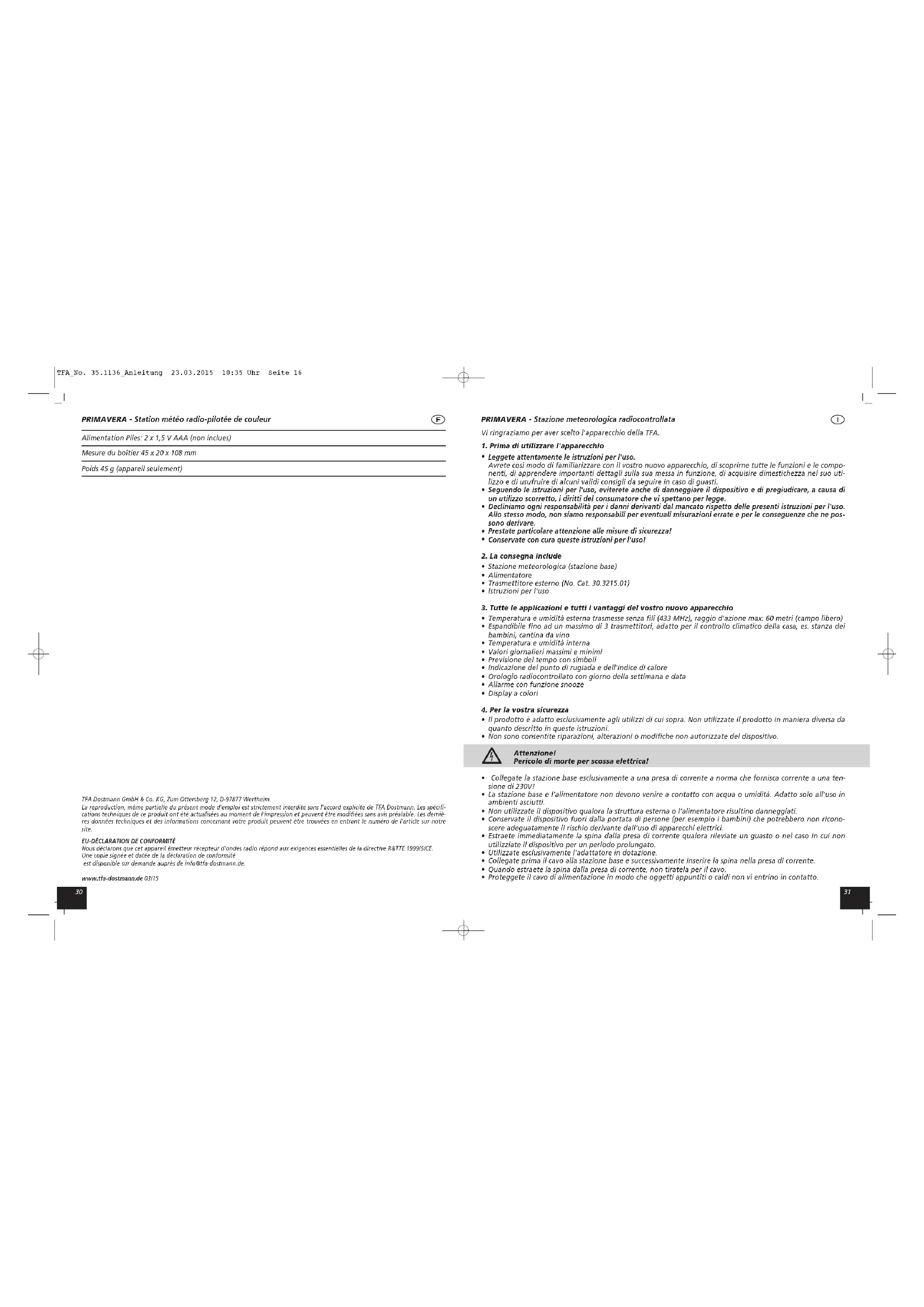 Scarica le istruzioni per il tuo Stazione Meteo in formato PDF gratuitamente! Trova il tuo manuale Primavera 35.1136.02 - TFA e riprendi in mano il tuo dispositivo elettronico. In questa pagina sono pubblicati tutti i documenti necessari per l'utilizzo del tuo dispositivo. Primavera 35.1136.02 del marchio TFA.