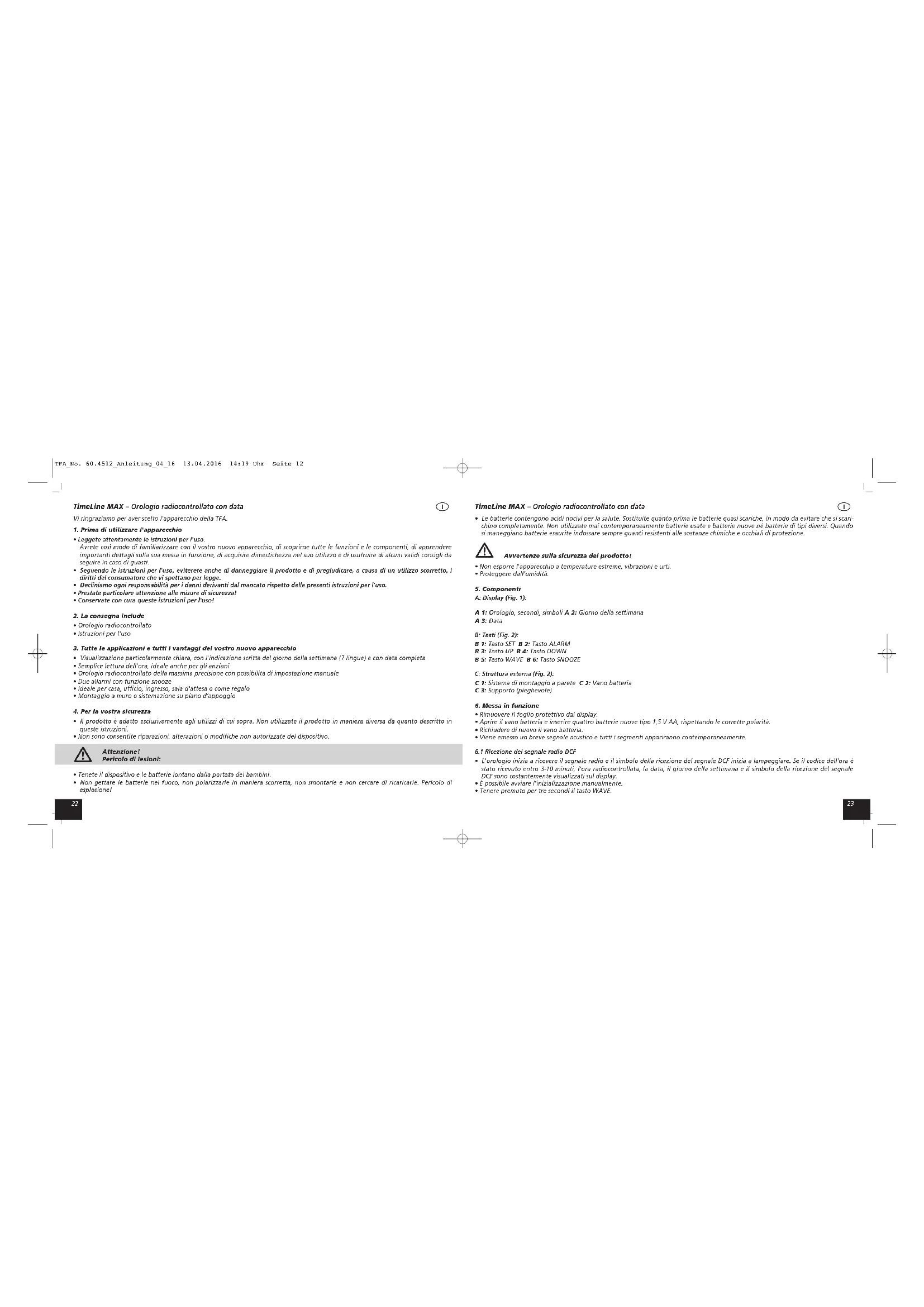 - Non gettare le batterie nel fuoco, non polarizzarle in maniera scorretta, non smontarle e non cercare di ricaricarle. Pericolo di esplosione! TFA_No. 60.4512_Anleitung_04_16 13.04.2016 14:19 Uhr Seite 122524 TimeLine MAX – Orologio radiocontrollato con data