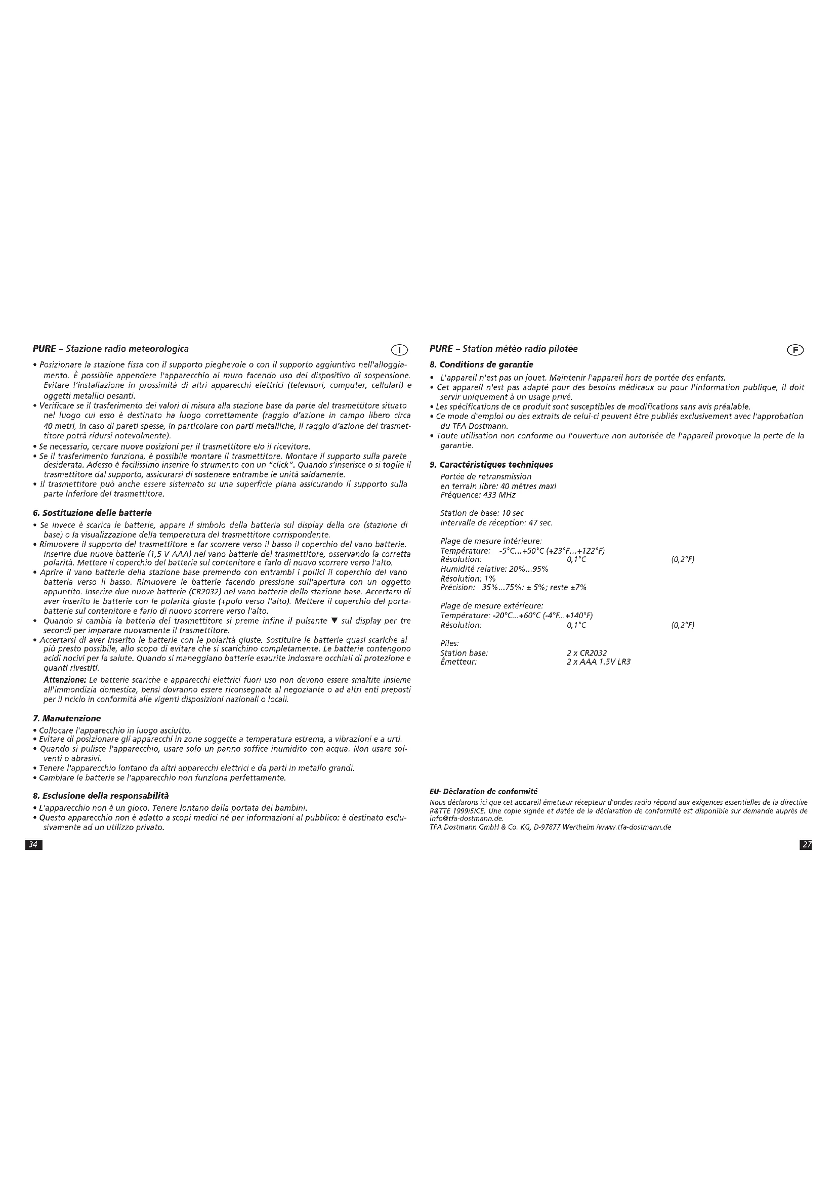 Con il presente dichiariamo che il presente impianto radio adempie alle prescrizioni sostanziali della direttiva R&TTE 1999/5/CE. Una copia firmata e datata della Dichiarazione di Conformità è disponibile, su richiesta, tramite info@tfa-dostmann.de TFA Dostmann GmbH & Co.KG, D-97877 Wertheim / ww.tfa-dostmann.de TFA_No. 35.1107 Anl_12_10.bel 10.12.2010 14:21 Uhr Seite 2634 PURE – Stazione radio meteorologica
