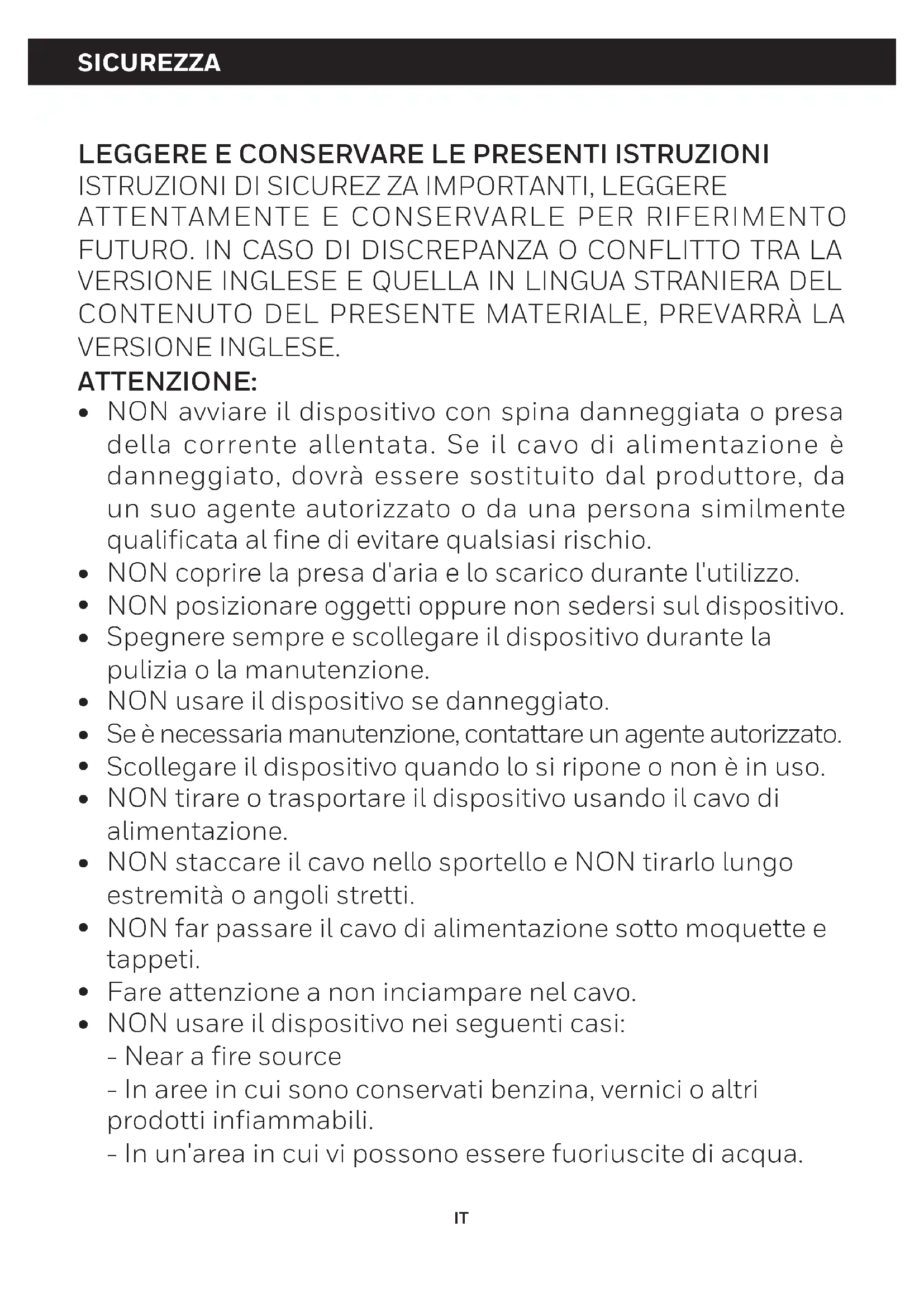 NON avviare il dispositivo con spina danneggiata o presa della corrente allentata. Se il cavo di alimentazione è danneggiato, dovrà essere sostituito dal produttore, da un suo agente autorizzato o da una persona similmente qualificata al fine di evitare qualsiasi rischio. NON coprire la presa d'aria e lo scarico durante l'utilizzo. NON posizionare oggetti oppure non sedersi sul dispositivo. Spegnere sempre e scollegare il dispositivo durante la pulizia o la manutenzione. NON usare il dispositivo se danneggiato. Se è necessaria manutenzione, contattare un agente autorizzato. Scollegare il dispositivo quando lo si ripone o non è in uso. NON tirare o trasportare il dispositivo usando il cavo di alimentazione. NON staccare il cavo nello sportello e NON tirarlo lungo estremità o angoli stretti. NON far passare il cavo di alimentazione sotto moquette e tappeti. Fare attenzione a non inciampare nel cavo. NON usare il dispositivo nei seguenti casi: - Near a fire source - In aree in cui sono conservati benzina, vernici o altri prodotti infiammabili. - In un'area in cui vi possono essere fuoriuscite di acqua.