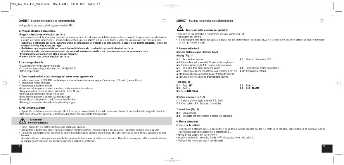- Non utilizzate mai contemporaneamente batterie usate e batterie nuove né batterie di tipi diversi. Quando si maneggiano batterie esaurite indossa- re sempre guanti resistenti alle sostanze chimiche e occhiali di protezione. TFA_No. 35.1143_Anleitung 28.11.2016 18:18 Uhr Seite 173534 CONNECT - Stazione meteorologica radiocontrollata