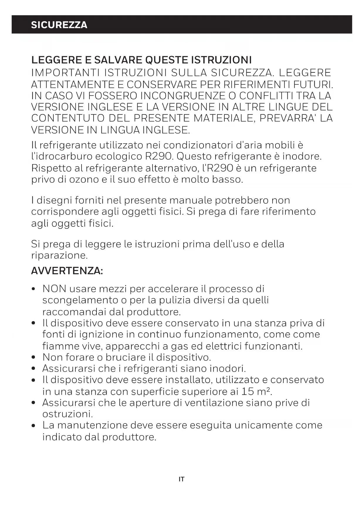 ITSICUREZZA (CONTINUA) NON coprire la prese d'aria e lo scarico durante l'utilizzo. NON posizionare oggetti, in particolare oggetti pesanti o caldi, sul dispositivo. NON sedere sul dispositivo. NON usare il dispositivo se danneggiato. NON modificare il dispositivo in alcun modo per evitare rischi. NON tirare o trasportare il dispositivo usando il cavo di alimentazione. NON chiudere il cavo di alimentazione nella porta e NON tirarlo lungo margini o spigoli vivi. Non forare o bruciare i refrigeranti. Assicurarsi che le aperture di ventilazione siano prive di ostruzioni. Spegnere sempre e scollegare il dispositivo dalla presa durante la pulizia o la manutenzione. Scollegare il dispositivo dalla presa quando lo si ripone o quando non è in uso. Il gas refrigerante potrebbe essere inodore. Il ristagno di possibili perdite di gas refrigerante in stanze non ventilate può comportare rischi di incendio o esplosione laddove il refrigerante dovesse entrare in contatto con riscaldatori elettrici, stufe o altre fonti di ignizione. Fare attenzione quando si ripone il dispositivo al fine di evitare danni meccanici. Usare solo strumenti raccomandati dal produttore per scongelamento o pulizia. NON usare una prolunga con questo dispositivo. Non inserire mai le dita o dei bastoncini all'interno della presa dell'aria. Avvertire i bambini di questi pericoli. NON usare il condizionatore d'aria in una stanza umida come il bagno o la lavanderia. Il produttore non si ritiene responsabile di lesioni causate a persone o danni a proprietà causati dalla mancata osservanza delle istruzioni di manutenzione e dall'uso improprio del dispositivo.