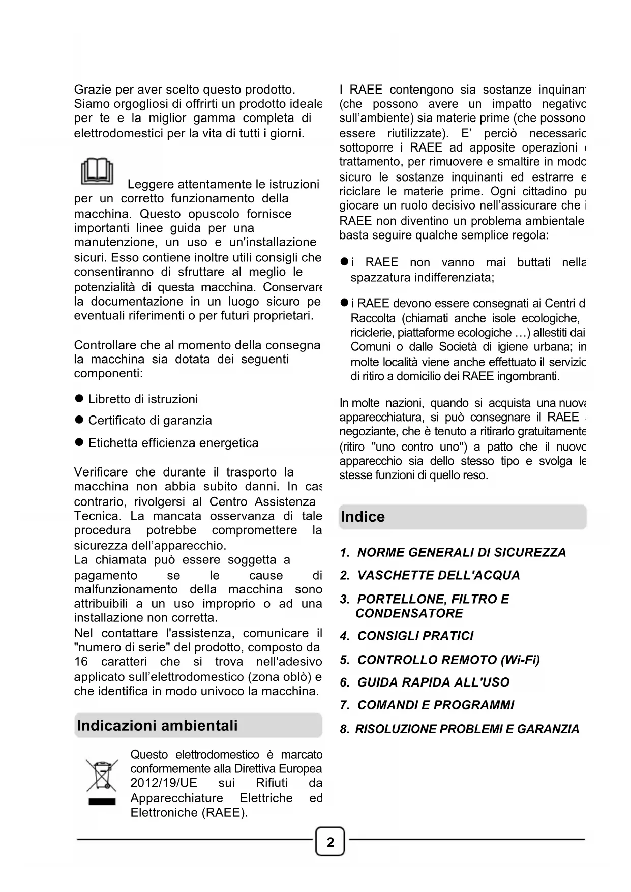 Grazie per aver scelto questo prodotto. Siamo orgogliosi di offrirti un prodotto ideale per te e la miglior gamma completa di elettrodomestici per la vita di tutti i giorni. Leggere attentamente le istruzioni per un corretto funzionamento della macchina. Questo opuscolo fornisce importanti linee guida per una manutenzione, un uso e un'installazione sicuri. Esso contiene inoltre utili consigli che consentiranno di sfruttare al meglio le potenzialità di questa macchina. Conservare la documentazione in un luogo sicuro per eventuali riferimenti o per futuri proprietari. Controllare che al momento della consegna la macchina sia dotata dei seguenti componenti: l Libretto di istruzioni l Certificato di garanzia l Etichetta efficienza energetica Verificare che durante il trasporto la macchina non abbia subito danni. In caso contrario, rivolgersi al Centro Assistenza Tecnica. La mancata osservanza di tale procedura potrebbe compromettere la sicurezza dell’apparecchio. La chiamata può essere soggetta a pagamento se le cause di malfunzionamento della macchina sono attribuibili a un uso improprio o ad una installazione non corretta. Nel contattare l'assistenza, comunicare il "numero di serie" del prodotto, composto da 16 caratteri che si trova nell'adesivo applicato sull’elettrodomestico (zona oblò) e che identifica in modo univoco la macchina.