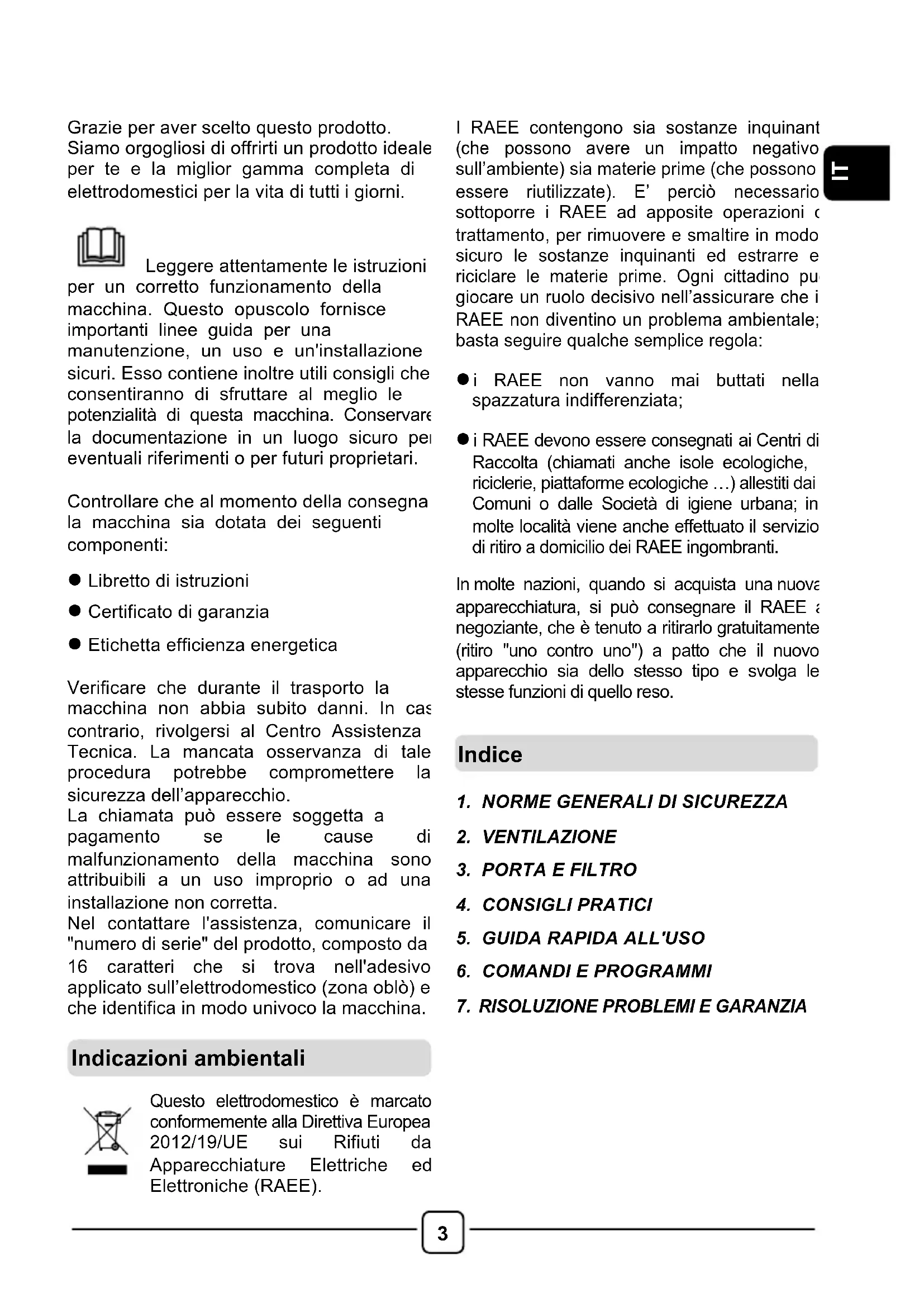 Grazie per aver scelto questo prodotto. Siamo orgogliosi di offrirti un prodotto ideale per te e la miglior gamma completa di elettrodomestici per la vita di tutti i giorni. Leggere attentamente le istruzioni per un corretto funzionamento della macchina. Questo opuscolo fornisce importanti linee guida per una manutenzione, un uso e un'installazione sicuri. Esso contiene inoltre utili consigli che consentiranno di sfruttare al meglio le potenzialità di questa macchina. Conservare la documentazione in un luogo sicuro per eventuali riferimenti o per futuri proprietari. Controllare che al momento della consegna la macchina sia dotata dei seguenti componenti: l Libretto di istruzioni l Certificato di garanzia l Etichetta efficienza energetica Verificare che durante il trasporto la macchina non abbia subito danni. In caso contrario, rivolgersi al Centro Assistenza Tecnica. La mancata osservanza di tale procedura potrebbe compromettere la sicurezza dell’apparecchio. La chiamata può essere soggetta a pagamento se le cause di malfunzionamento della macchina sono attribuibili a un uso improprio o ad una installazione non corretta. Nel contattare l'assistenza, comunicare il "numero di serie" del prodotto, composto da 16 caratteri che si trova nell'adesivo applicato sull’elettrodomestico (zona oblò) e che identifica in modo univoco la macchina.