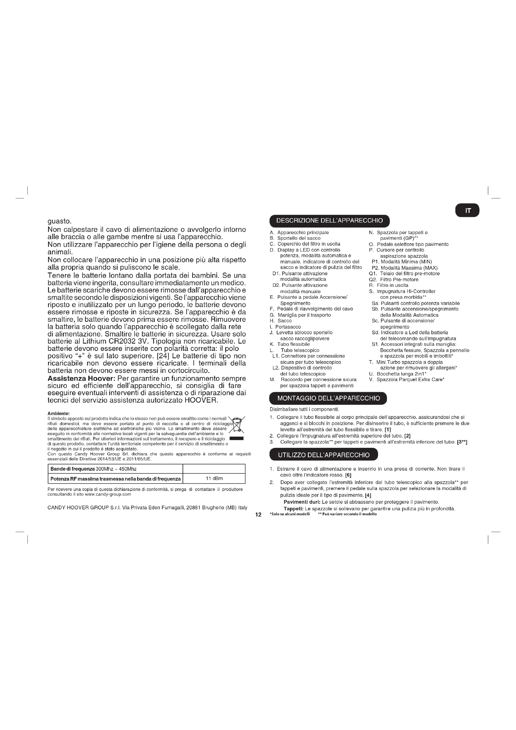Questo apparecchio deve essere utilizzato esclusivamente in ambito domestico per interventi di pulizia, secondo le istruzioni riportate nel presente documento. Accertarsi di aver compreso le istruzioni prima di mettere in funzione l’apparecchio. Non lasciare l’apparecchio collegato alla corrente. Prima di procedere alla pulizia dell’apparecchio o di effettuare qualsiasi operazione di manutenzione, spegnere sempre l’apparecchio e scollegare la spina. Questo elettrodomestico non è destinato a essere utilizzato da bambini di età inferiore a 8 anni e da persone dalle ridotte capacità siche, sensoriali o mentali, o senza esperienza a causa di una inadeguata informazione sull’uso in sicurezza dell’apparecchio e sui relativi pericoli. Controllare che i bambini non giochino con l’apparecchio. Pulizia e manutenzione non possono essere eseguite da bambini senza sorveglianza da parte di una persona responsabile. Se il cavo di alimentazione è danneggiato, interrompere immediatamente l’utilizzo dell’apparecchio. Per evitare pericoli, il cavo di alimentazione dovrà essere sostituito da un tecnico del servizio assistenza autorizzato Hoover. Tenere le mani, i piedi, i capi di abbigliamento non attillati e i capelli lontani dalle spazzole rotanti. Utilizzare solo accessori o parti di consumo e di ricambio consigliati o forniti da HOOVER. Elettricità statica: alcuni tappeti possono produrre un accumulo di elettricità statica. Le cariche di elettricità statica non sono pericolose per la salute. Non utilizzare l’apparecchio all’aperto, su superci bagnate o per aspirare liquidi. Non aspirare oggetti solidi o appuntiti, ammiferi, ceneri calde, mozziconi di sigaretta o similari. Non vaporizzare o aspirare liquidi inammabili, detergenti, bombolette o i loro vapori. Non calpestare il cavo di alimentazione durante l’utilizzo dell’apparecchio o scollegare la spina dalla presa tirando il cavo di alimentazione. Non continuare a utilizzare l’apparecchio in caso di presunto IT12 guasto. Non calpestare il cavo di alimentazione o avvolgerlo intorno alle braccia o alle gambe mentre si usa l’apparecchio. Non utilizzare l’apparecchio per l’igiene della persona o degli animali. Non collocare l’apparecchio in una posizione più alta rispetto alla propria quando si puliscono le scale. Tenere le batterie lontano dalla portata dei bambini. Se una batteria viene ingerita, consultare immediatamente un medico. Le batterie scariche devono essere rimosse dall’apparecchio e smaltite secondo le disposizioni vigenti. Se l’apparecchio viene riposto e inutilizzato per un lungo periodo, le batterie devono essere rimosse e riposte in sicurezza. Se l’apparecchio è da smaltire, le batterie devono prima essere rimosse. Rimuovere la batteria solo quando l’apparecchio è scollegato dalla rete di alimentazione. Smaltire le batterie in sicurezza. Usare solo batterie al Lithium CR2032 3V. Tipologia non ricaricabile. Le batterie devono essere inserite con polarità corretta: il polo positivo “+” è sul lato superiore. [24] Le batterie di tipo non ricaricabile non devono essere ricaricate. I terminali della batteria non devono essere messi in cortocircuito. Assistenza Hoover: Per garantire un funzionamento sempre sicuro ed efciente dell’apparecchio, si consiglia di fare eseguire eventuali interventi di assistenza o di riparazione dai tecnici del servizio assistenza autorizzato HOOVER. Ambiente: Il simbolo apposto sul prodotto indica che lo stesso non può essere smaltito come i normali riuti domestici, ma deve essere portato al punto di raccolta o al centro di riciclaggio delle apparecchiature elettriche ed elettroniche più vicino. Lo smaltimento deve essere eseguito in conformità alle normative locali vigenti per la salvaguardia dell’ambiente e lo smaltimento dei riuti. Per ulteriori informazioni sul trattamento, il recupero e il riciclaggio di questo prodotto, contattare l’unità territoriale competente per il servizio di smaltimento o il negozio in cui il prodotto è stato acquistato. Con questo Candy Hoover Group Srl, dichiara che questo apparecchio è conforme ai requisiti essenziali delle Direttive 2014/53/UE e 2011/65/UE. Per ricevere una copia di questa dichiarazione di conformità, si prega di contattare il produttore consultando il sito www.candy-group.com CANDY HOOVER GROUP S.r.l. Via Privata Eden Fumagalli, 20861 Brugherio (MB) Italy