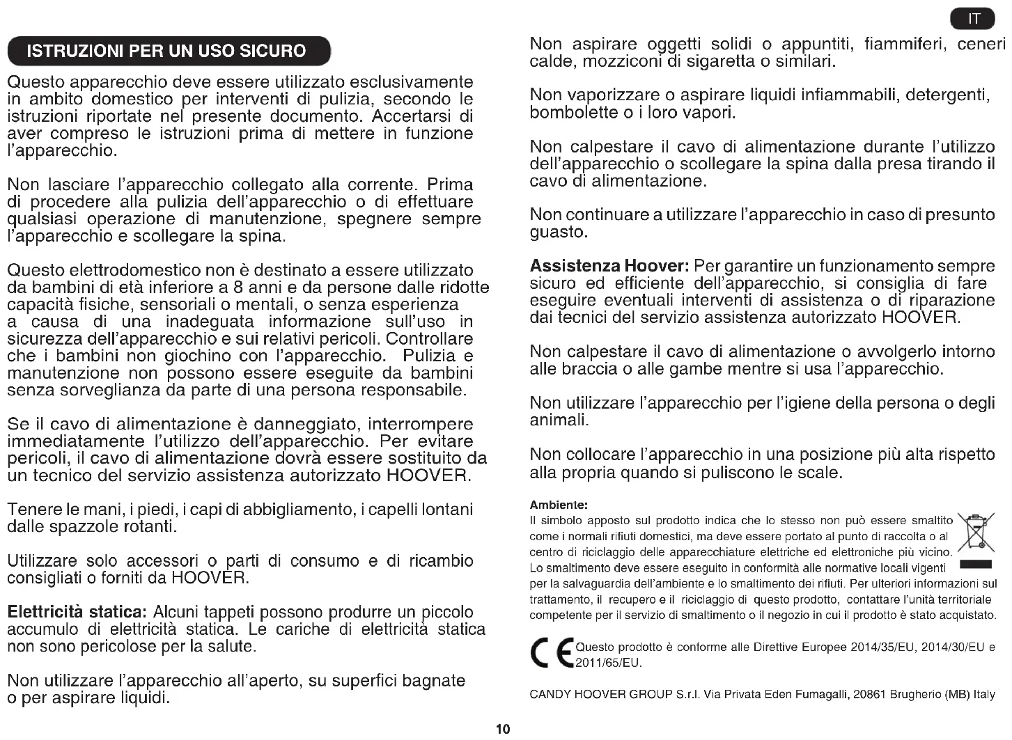 Questo apparecchio deve essere utilizzato esclusivamente in ambito domestico per interventi di pulizia, secondo le istruzioni riportate nel presente documento. Accertarsi di aver compreso le istruzioni prima di mettere in funzione l’apparecchio. Non lasciare l’apparecchio collegato alla corrente. Prima di procedere alla pulizia dell’apparecchio o di effettuare qualsiasi operazione di manutenzione, spegnere sempre l’apparecchio e scollegare la spina. Questo elettrodomestico non è destinato a essere utilizzato da bambini di età inferiore a 8 anni e da persone dalle ridotte capacità siche, sensoriali o mentali, o senza esperienza a causa di una inadeguata informazione sull’uso in sicurezza dell’apparecchio e sui relativi pericoli. Controllare che i bambini non giochino con l’apparecchio. Pulizia e manutenzione non possono essere eseguite da bambini senza sorveglianza da parte di una persona responsabile. Se il cavo di alimentazione è danneggiato, interrompere immediatamente l’utilizzo dell’apparecchio. Per evitare pericoli, il cavo di alimentazione dovrà essere sostituito da un tecnico del servizio assistenza autorizzato HOOVER. Tenere le mani, i piedi, i capi di abbigliamento, i capelli lontani dalle spazzole rotanti. Utilizzare solo accessori o parti di consumo e di ricambio consigliati o forniti da HOOVER. Elettricità statica: Alcuni tappeti possono produrre un piccolo accumulo di elettricità statica. Le cariche di elettricità statica non sono pericolose per la salute. Non utilizzare l’apparecchio all’aperto, su superci bagnate o per aspirare liquidi. Non aspirare oggetti solidi o appuntiti, ammiferi, ceneri calde, mozziconi di sigaretta o similari. Non vaporizzare o aspirare liquidi inammabili, detergenti, bombolette o i loro vapori. Non calpestare il cavo di alimentazione durante l’utilizzo dell’apparecchio o scollegare la spina dalla presa tirando il cavo di alimentazione. Non continuare a utilizzare l’apparecchio in caso di presunto guasto. Assistenza Hoover: Per garantire un funzionamento sempre sicuro ed efciente dell’apparecchio, si consiglia di fare eseguire eventuali interventi di assistenza o di riparazione dai tecnici del servizio assistenza autorizzato HOOVER. Non calpestare il cavo di alimentazione o avvolgerlo intorno alle braccia o alle gambe mentre si usa l’apparecchio. Non utilizzare l’apparecchio per l’igiene della persona o degli animali. Non collocare l’apparecchio in una posizione più alta rispetto alla propria quando si puliscono le scale. Ambiente: Il simbolo apposto sul prodotto indica che lo stesso non può essere smaltito come i normali riuti domestici, ma deve essere portato al punto di raccolta o al centro di riciclaggio delle apparecchiature elettriche ed elettroniche più vicino. Lo smaltimento deve essere eseguito in conformità alle normative locali vigenti per la salvaguardia dell’ambiente e lo smaltimento dei riuti. Per ulteriori informazioni sul trattamento, il recupero e il riciclaggio di questo prodotto, contattare l’unità territoriale competente per il servizio di smaltimento o il negozio in cui il prodotto è stato acquistato. Questo prodotto è conforme alle Direttive Europee 2014/35/EU, 2014/30/EU e 2011/65/EU. CANDY HOOVER GROUP S.r.l. Via Privata Eden Fumagalli, 20861 Brugherio (MB) Italy IT11 *Solo su alcuni modelli **Il design delle spazzole può variare secondo il modello