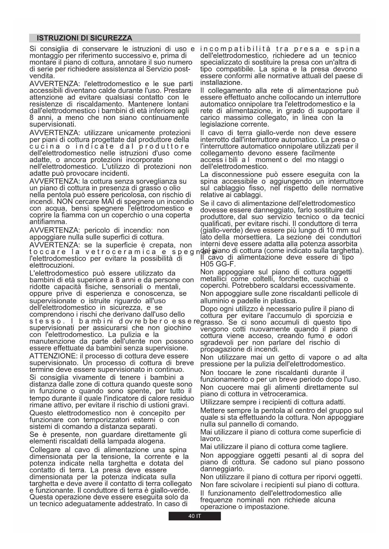 - da je dovod plina brezhiben Če vam ne uspe odpraviti nepravilnosti v delovanju, izključite kuhalno ploščo in pokličite najbližji pooblaščeni servis. DADA40 IT Si consiglia di conservare le istruzioni di uso e montaggio per riferimento successivo e, prima di montare il piano di cottura, annotare il suo numero di serie per richiedere assistenza al Servizio post- vendita. AVVERTENZA: l'elettrodomestico e le sue parti accessibili diventano calde durante l'uso. Prestare attenzione ad evitare qualsiasi contatto con le resistenze di riscaldamento. Mantenere lontani dall'elettrodomestico i bambini di età inferiore agli 8 anni, a meno che non siano continuamente supervisionati. AVVERTENZA: utilizzare unicamente protezioni per piani di cottura progettate dal produttore della c u c i n a o i n d i c a t e d a l p r o d u t t o r e dell'elettrodomestico nelle istruzioni d'uso come adatte, o ancora protezioni incorporate nell'elettrodomestico. L'utilizzo di protezioni non adatte può provocare incidenti. AVVERTENZA: la cottura senza sorveglianza su un piano di cottura in presenza di grasso o olio nella pentola può essere pericolosa, con rischio di incendi. NON cercare MAI di spegnere un incendio con acqua, bensì spegnere l'elettrodomestico e coprire la fiamma con un coperchio o una coperta antifiamma. AVVERTENZA: pericolo di incendio: non appoggiare nulla sulle superfici di cottura. AVVERTENZA: se la superficie è crepata, non t o c c a r e l a v e t r o c e r a m i c a e s p e g n e r e l'elettrodomestico per evitare la possibilità di elettrocuzioni. L'elettrodomestico può essere utilizzato da bambini di età superiore a 8 anni e da persone con ridotte capacità fisiche, sensoriali o mentali, oppure prive di esperienza e conoscenza, se supervisionate o istruite riguardo all'uso dell'elettrodomestico in sicurezza, e se comprendono i rischi che derivano dall'uso dello s t e s s o . I b a mb i ni d ov re b be r o e ss e re supervisionati per assicurarsi che non giochino con l'elettrodomestico. La pulizia e la manutenzione da parte dell'utente non possono essere effettuate da bambini senza supervisione. ATTENZIONE: il processo di cottura deve essere supervisionato. Un processo di cottura di breve termine deve essere supervisionato in continuo. Si consiglia vivamente di tenere i bambini a distanza dalle zone di cottura quando queste sono in funzione o quando sono spente, per tutto il tempo durante il quale l'indicatore di calore residuo rimane attivo, per evitare il rischio di ustioni gravi. Questo elettrodomestico non è concepito per funzionare con temporizzatori esterni o con sistemi di comando a distanza separati. Se è presente, non guardare direttamente gli elementi riscaldati della lampada alogena. Collegare al cavo di alimentazione una spina dimensionata per la tensione, la corrente e la potenza indicate nella targhetta e dotata del contatto di terra. La presa deve essere dimensionata per la potenza indicata sulla targhetta e deve avere il contatto di terra collegato e funzionante. Il conduttore di terra è giallo-verde. Questa operazione deve essere eseguita solo da un tecnico adeguatamente addestrato. In caso di