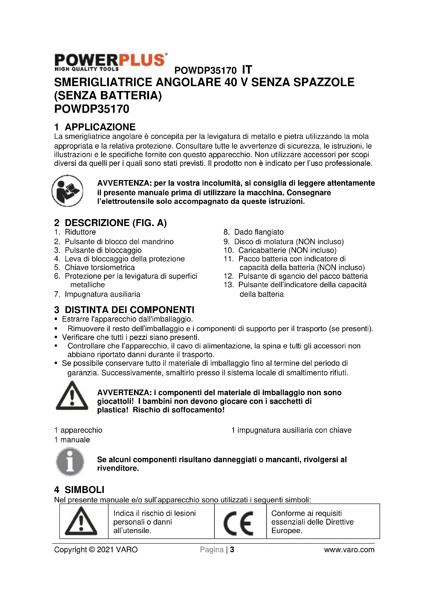 Conforme ai requisiti essenziali delle Direttive Europee.POWDP35170 IT Copyright © 2021 VARO Pagina | 4 www.varo.com
